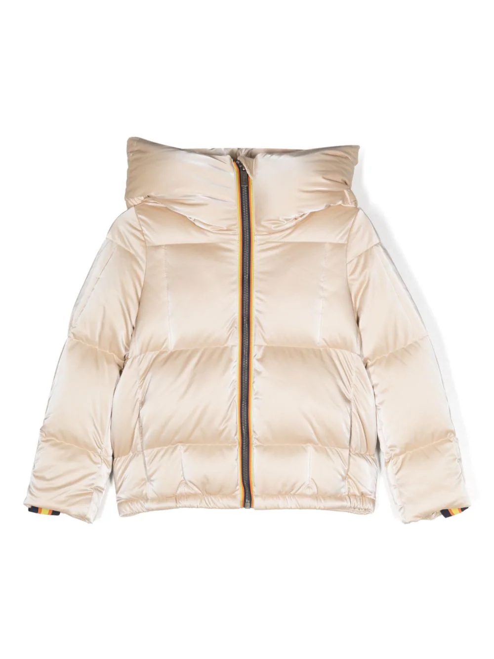 Beige chiaro, piumino d'anatra, dettaglio a righe, cappuccio, chiusura frontale con zip, maniche lunghe, due tasche con inserti, orlo elasticizzato e orlo dritto.
