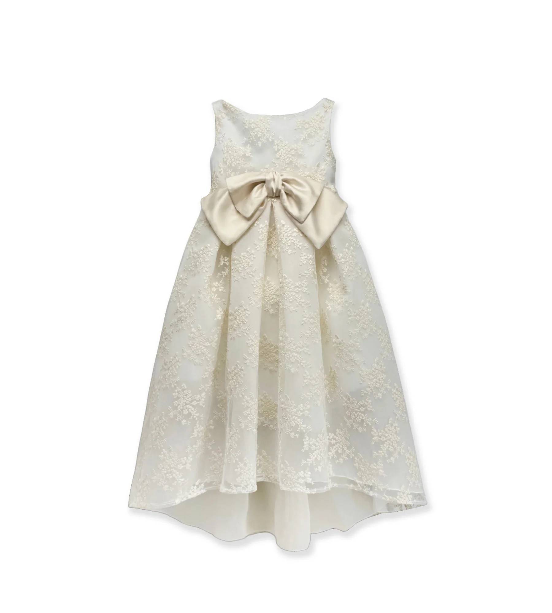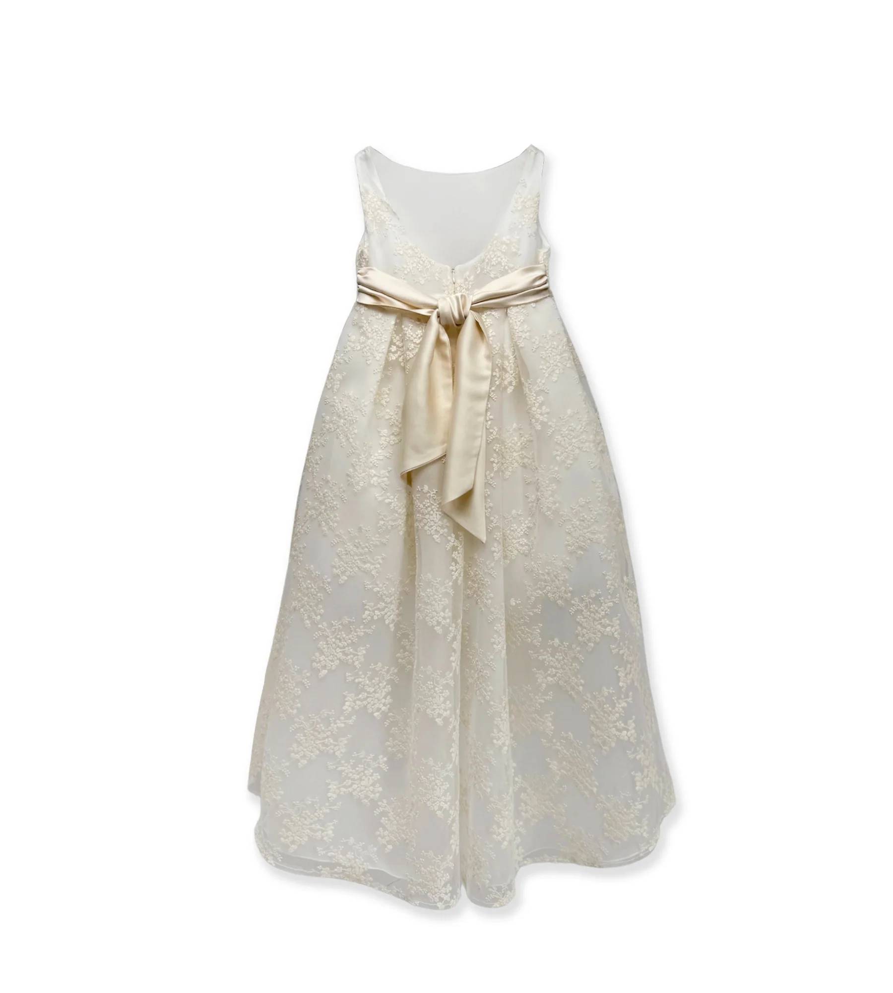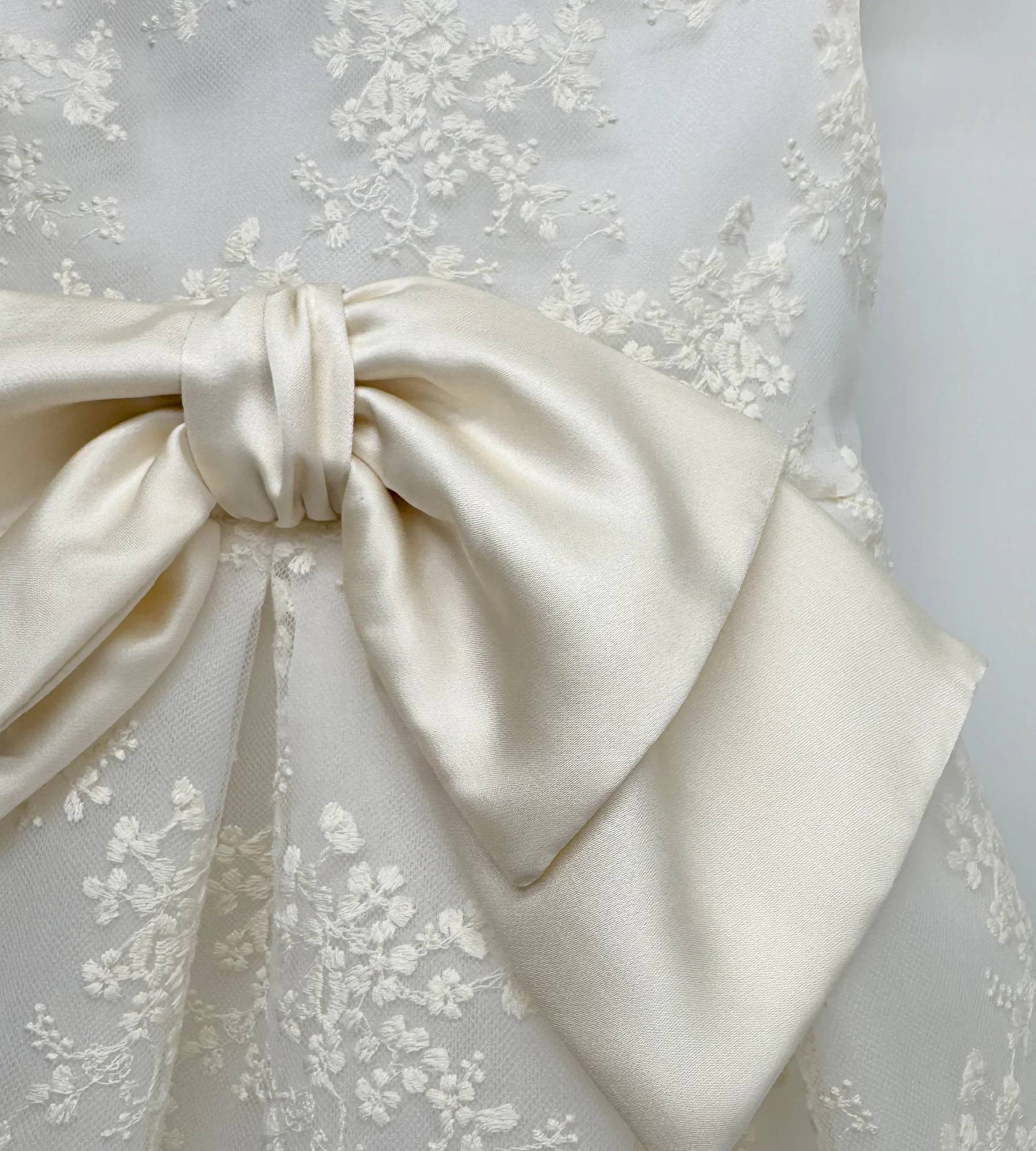 Abito lungo interamente realizzato in prezioso tulle ricamato color champagne con fiocco in raso abbinato e gonna realizzata più lunga sul retro