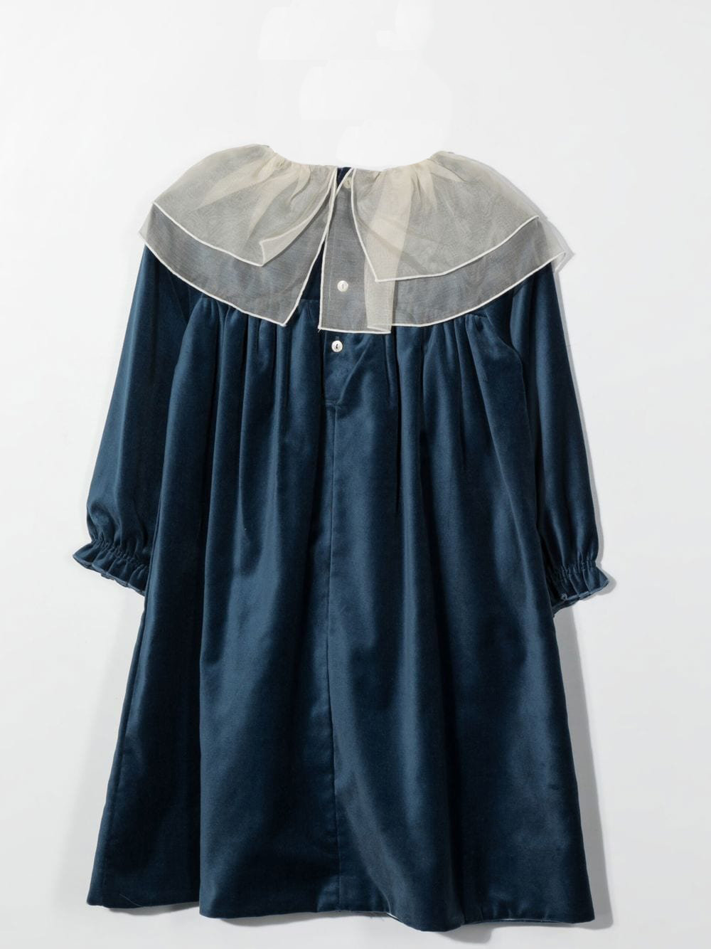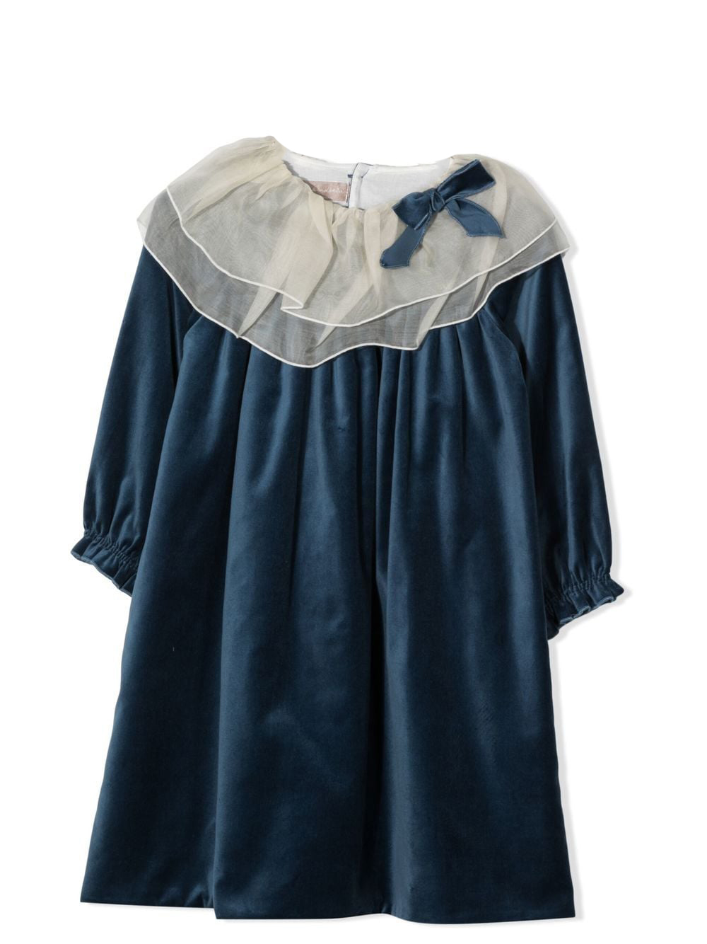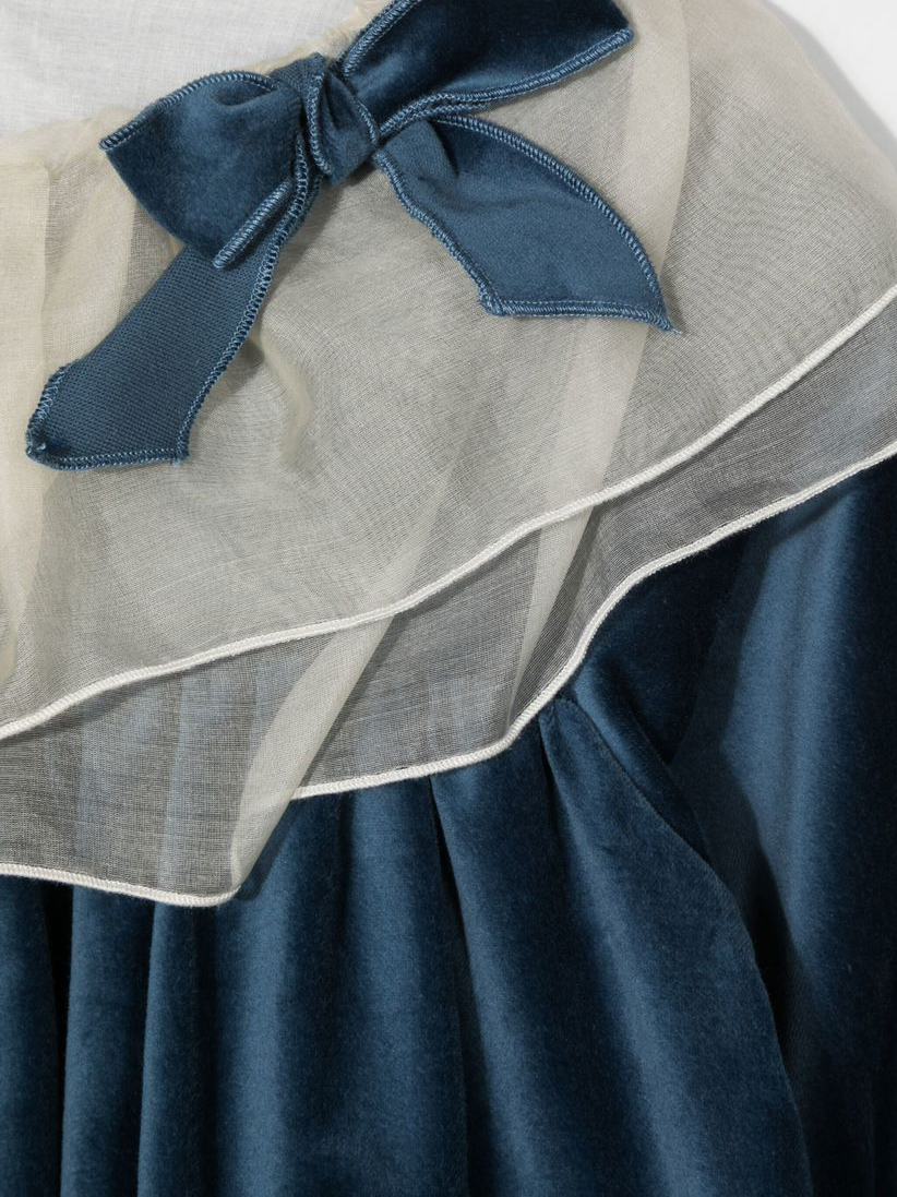 Blu, cotone, effetto velluto, dettaglio fiocco, chiusura posteriore con bottone, colletto rotondo, maniche lunghe e orlo dritto.