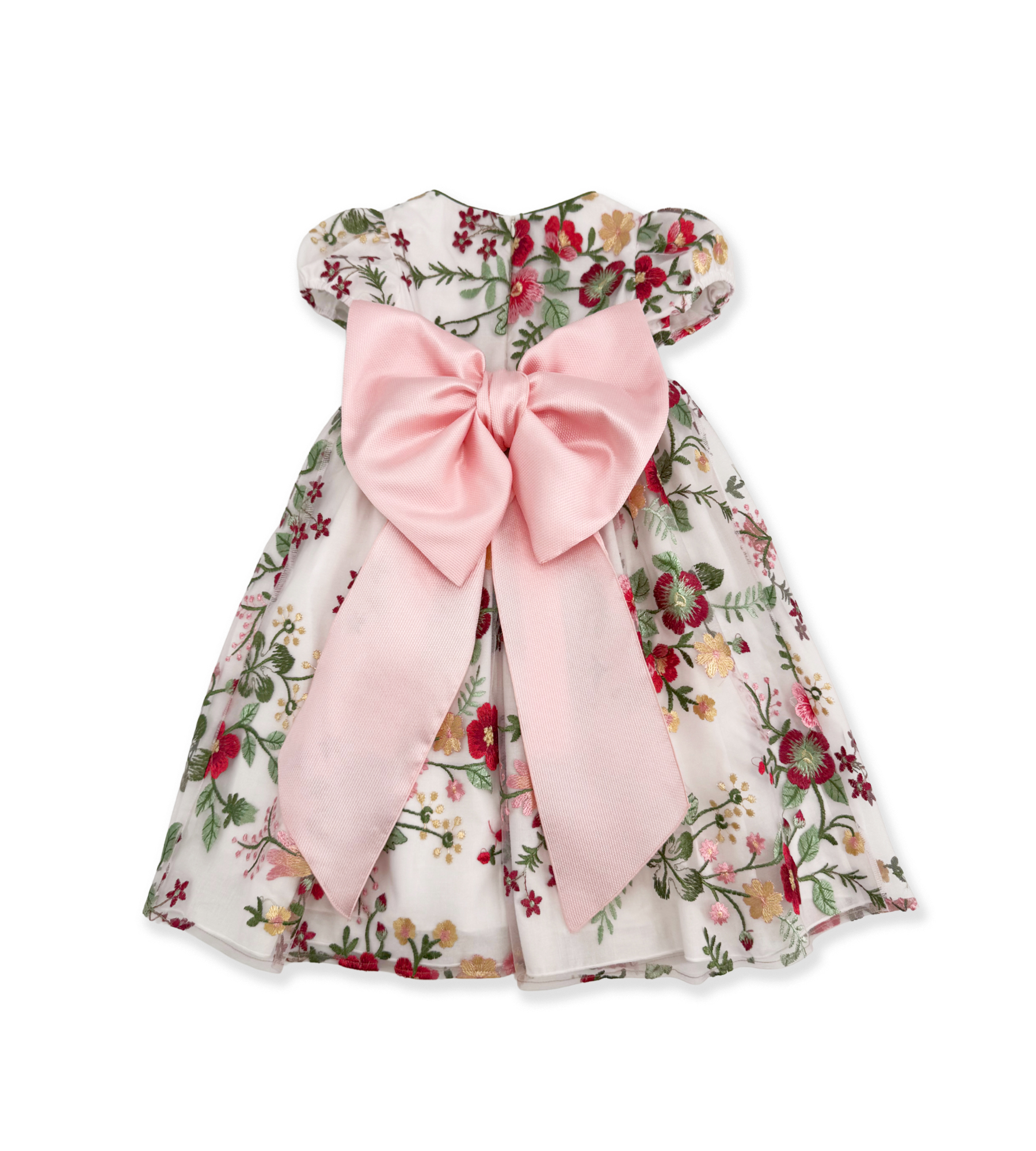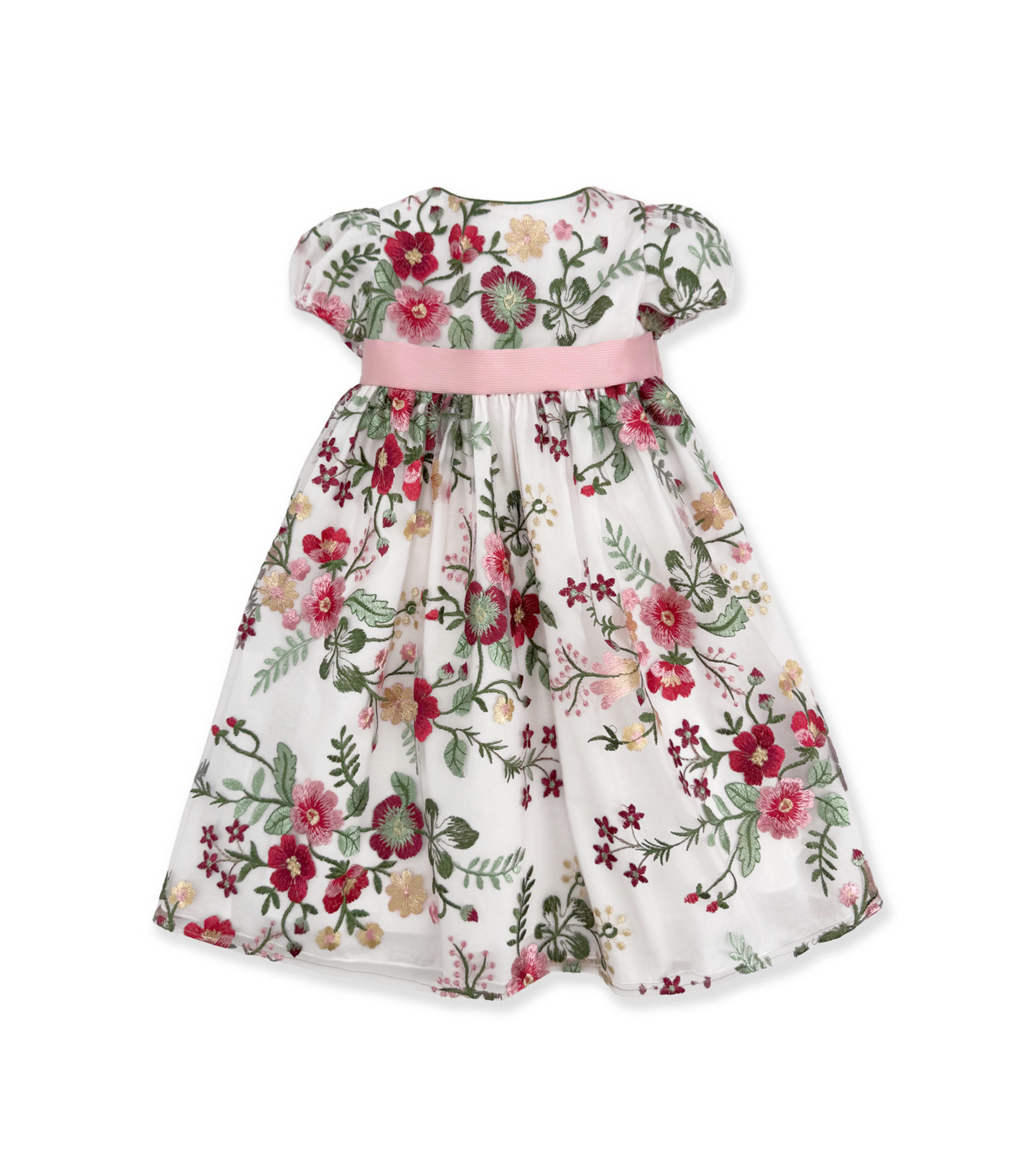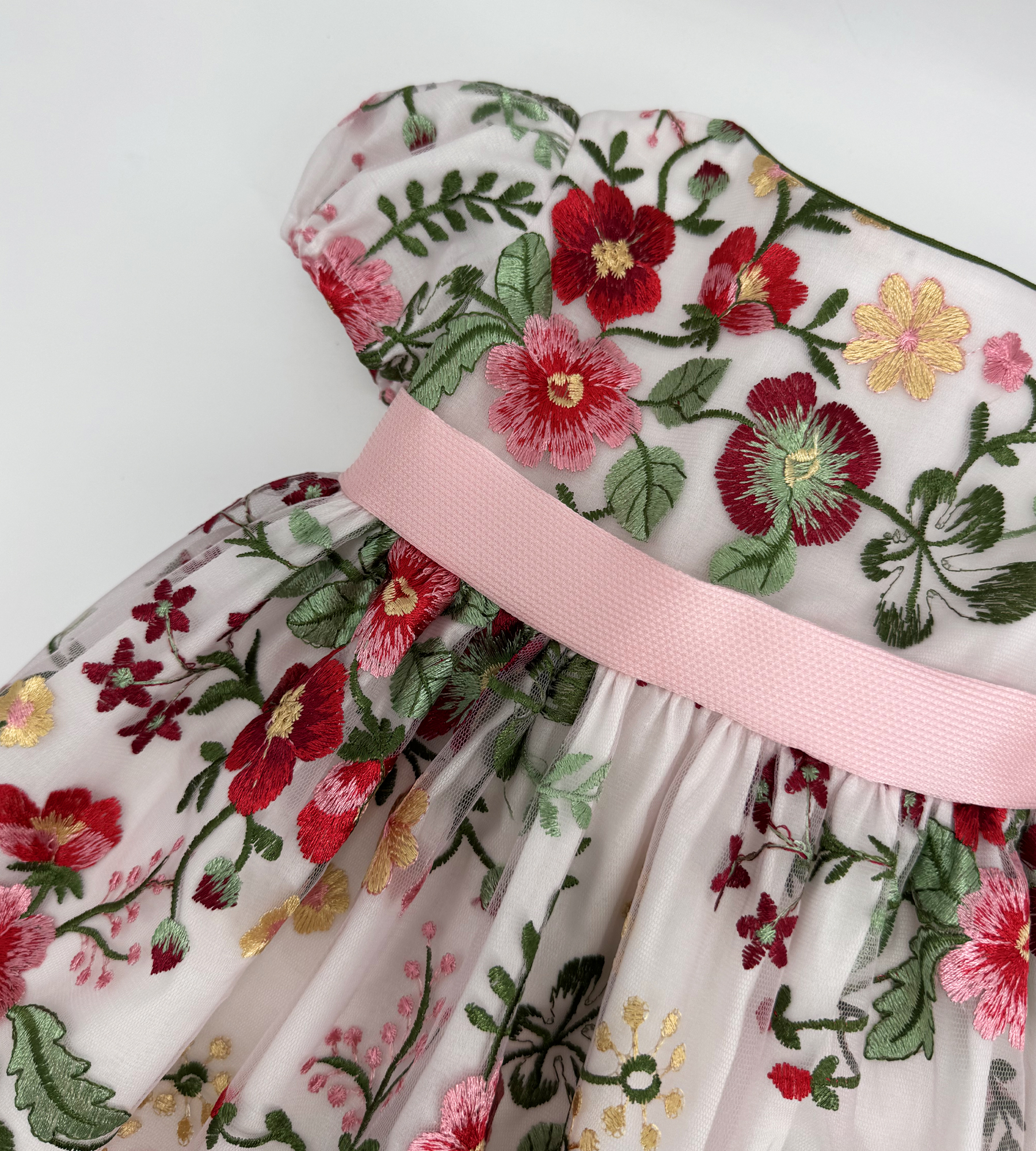 Abito con stampa a fiori, lungo, con fascia rosa in vita.
