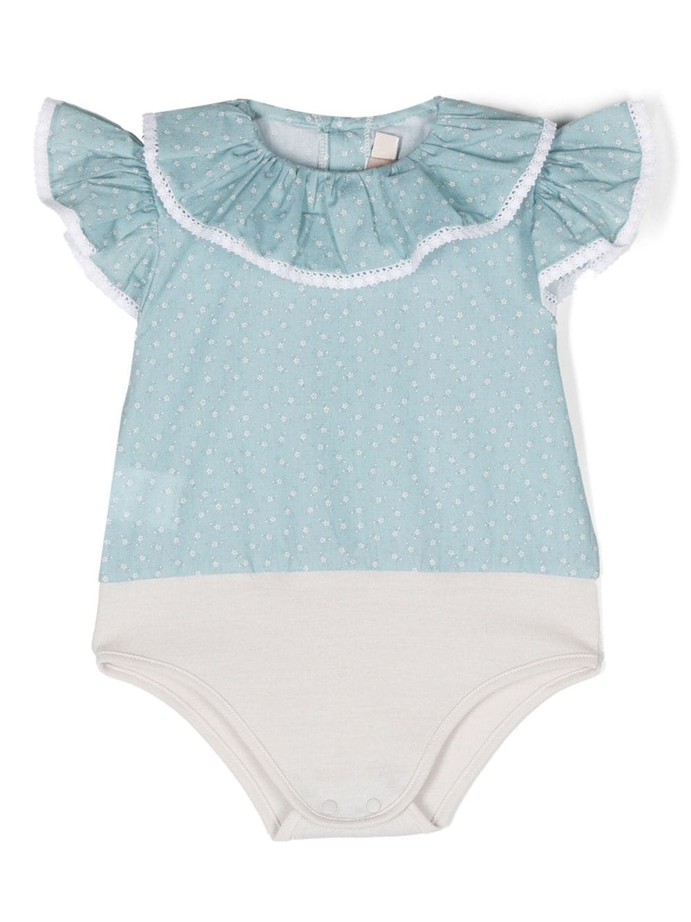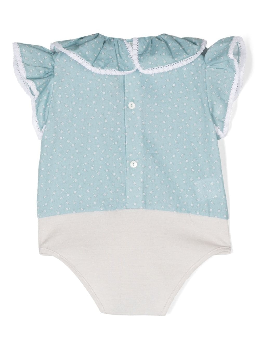 bordo in pizzo, colletto con increspature, chiusura posteriore con bottone, chiusura frontale nascosta con bottoni a pressione e maniche corte.