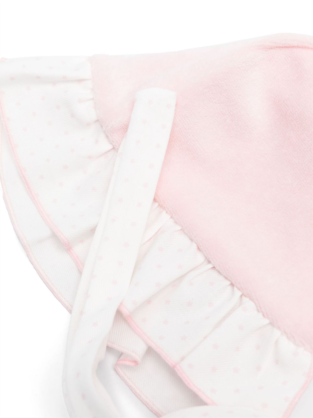 Rosa chiaro, bianco, cotone, chiusura frontale con fiocco, stampa a pois, design a inserti, rifinitura con ruches e trama in rilievo effetto ciniglia.