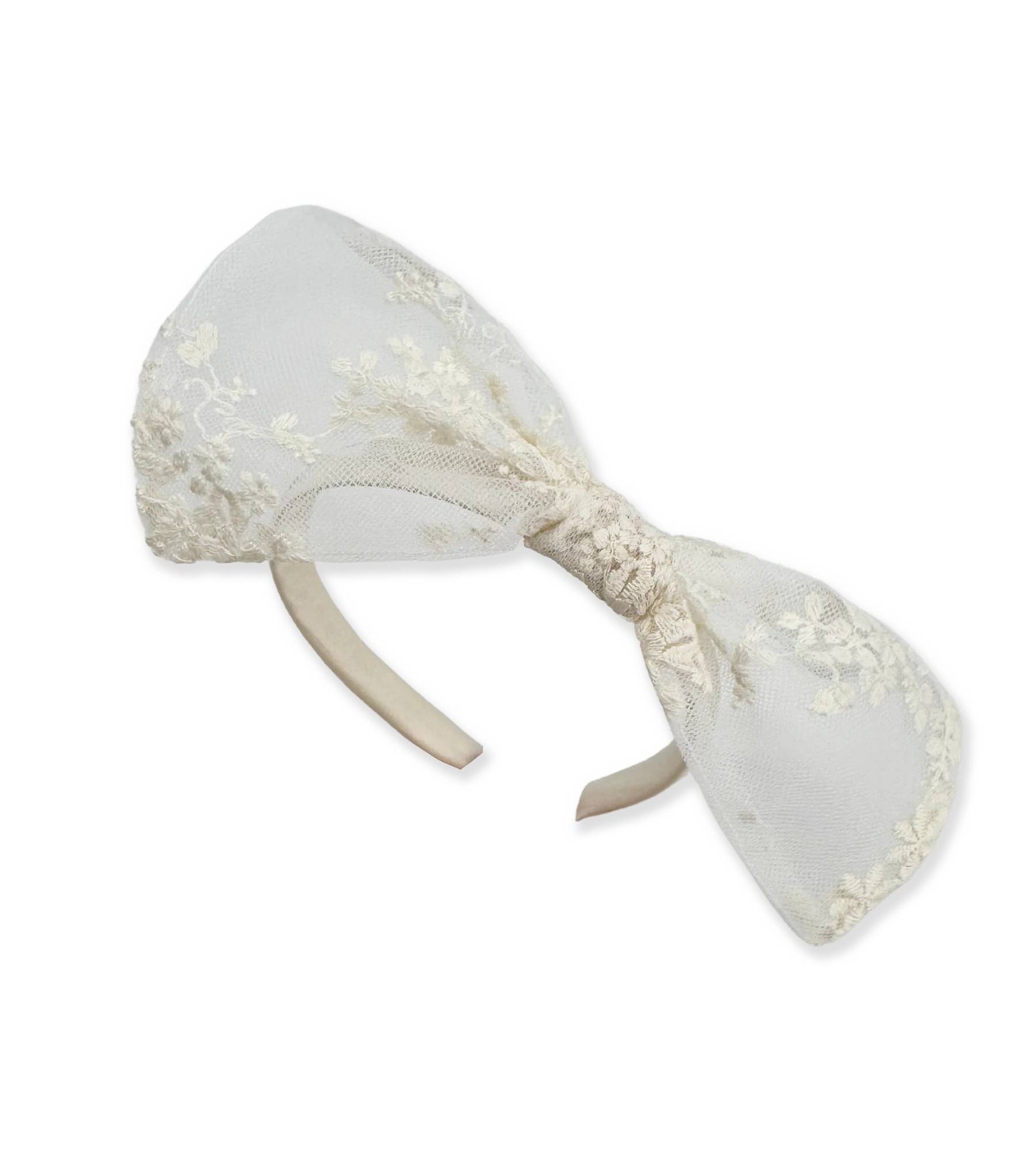 Cerchietto foderato con fiocco in tulle ricamato color champagne