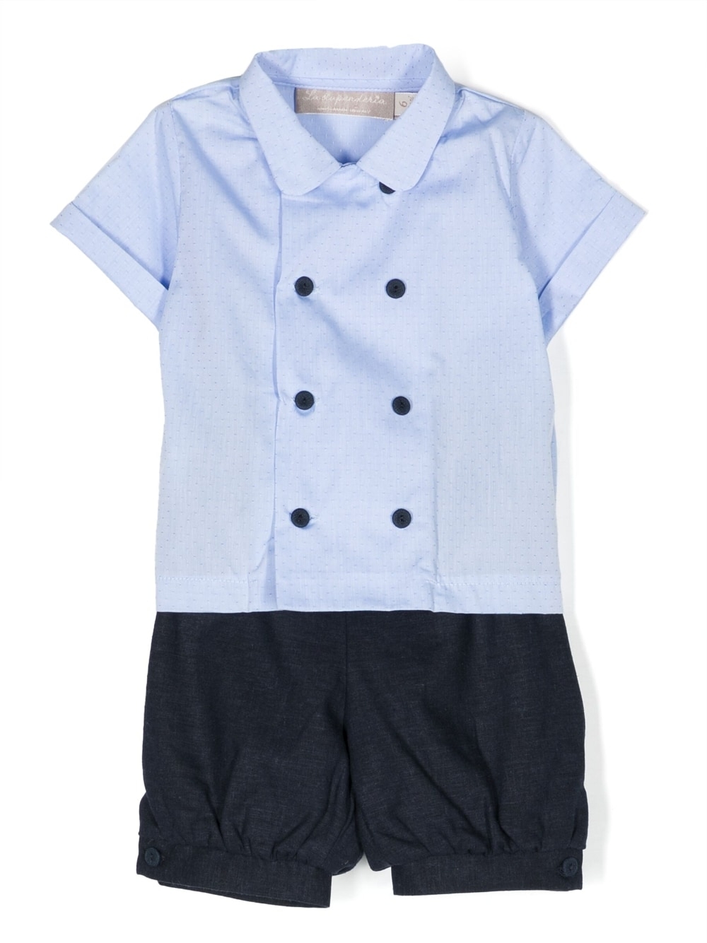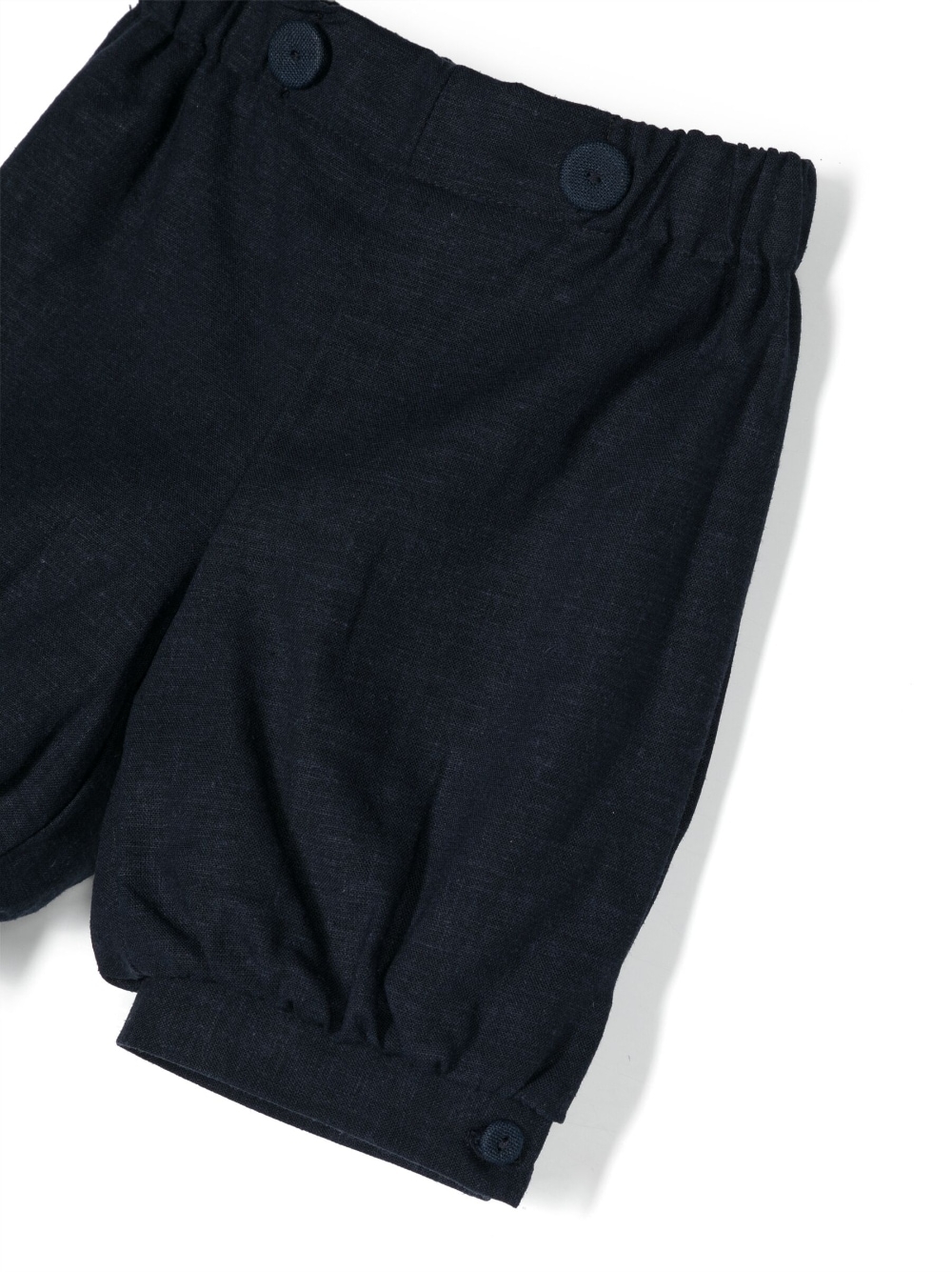 Completo in cotone-lino con polsini abbottonati de LA STUPENDERIA. Colore blu navy, lino/lino, cotone, elastico in vita, chiusura frontale con bottoni e polsini con bottone.