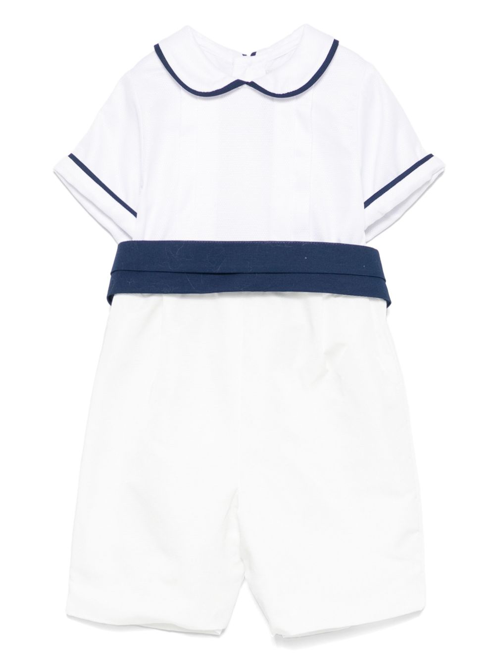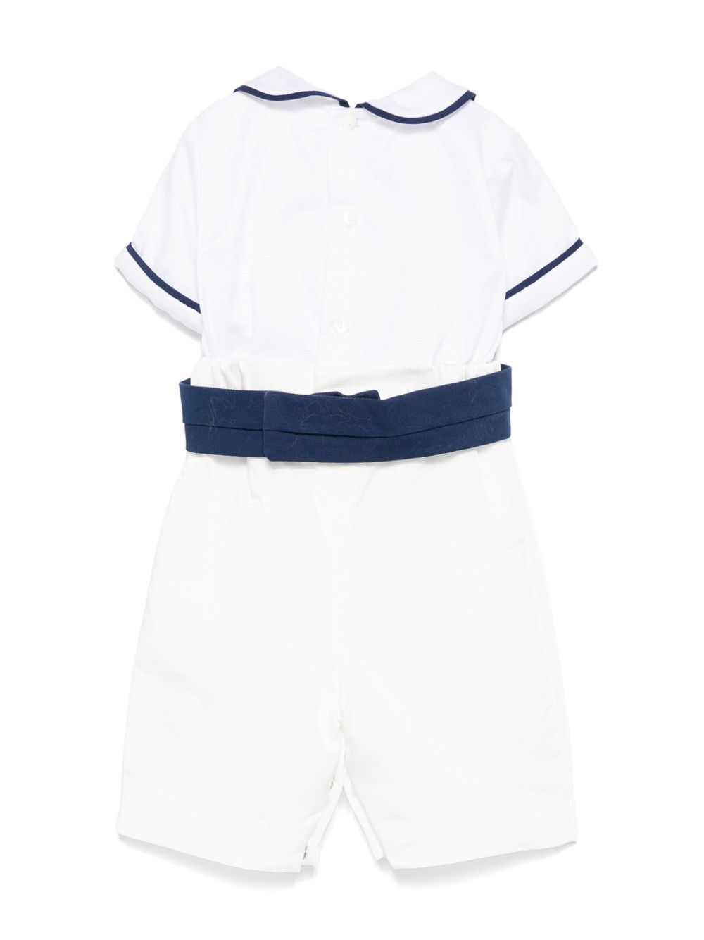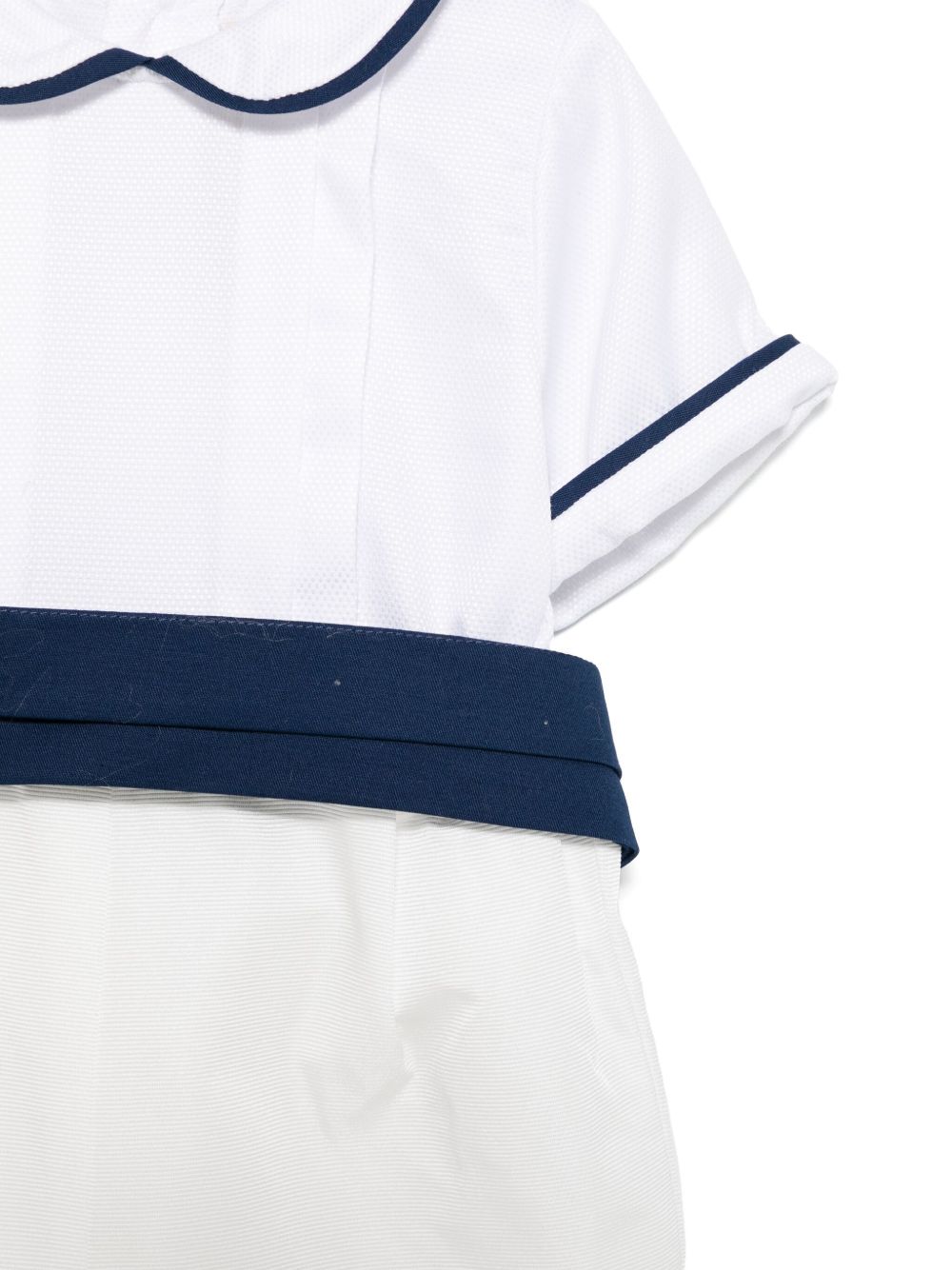 chiusura posteriore con bottoni bianchi, colletto Peter Pan, maniche corte,con cintura