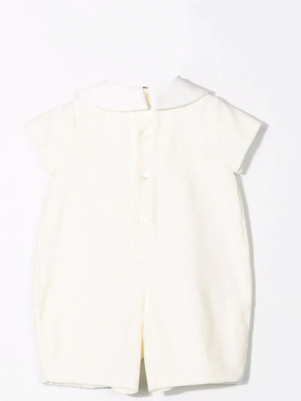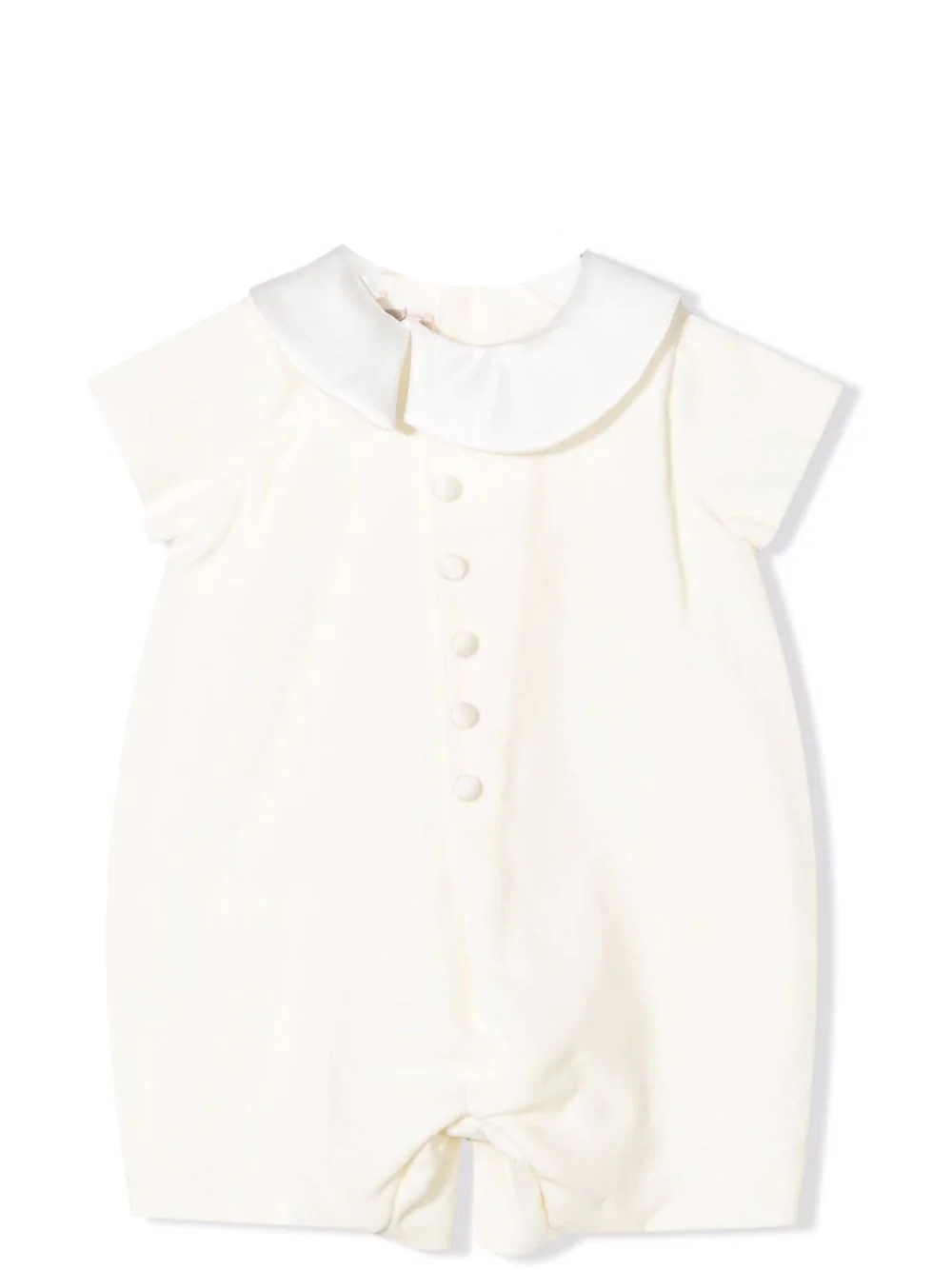 Colletto Peter Pan, chiusura frontale con bottoni, maniche corte e chiusura posteriore con bottone.