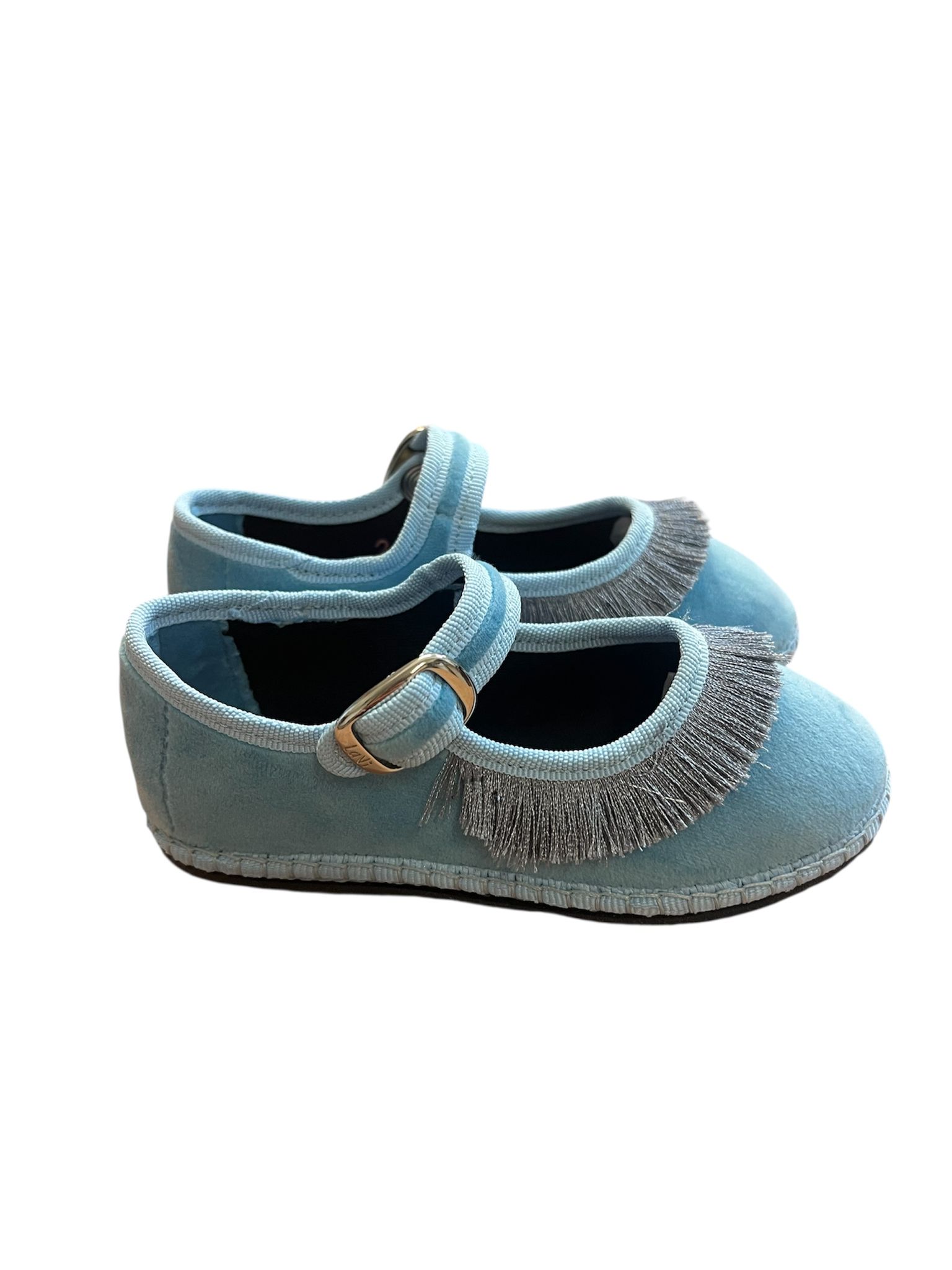 LaVì baby Frangia, lavorata a mano, in velluto, con suola di gomma e laccetto regolabile.