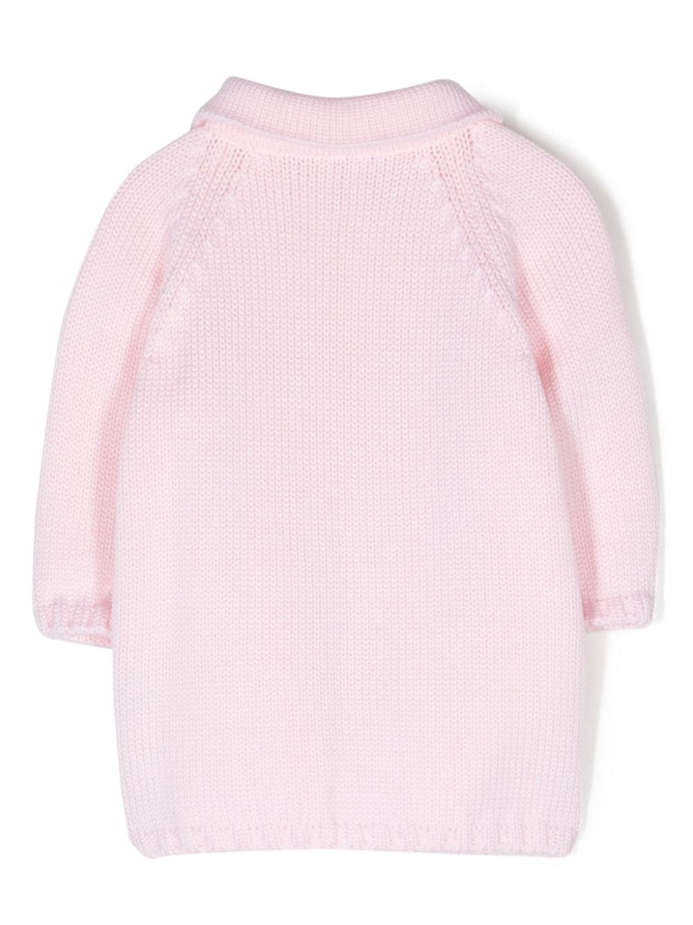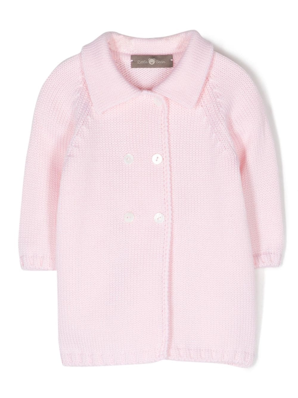 Rosa chiaro, lana vergine, maglia fine, colletto alla francese, chiusura doppiopetto con bottoni, maniche lunghe, polsini elasticizzati e orlo dritto.