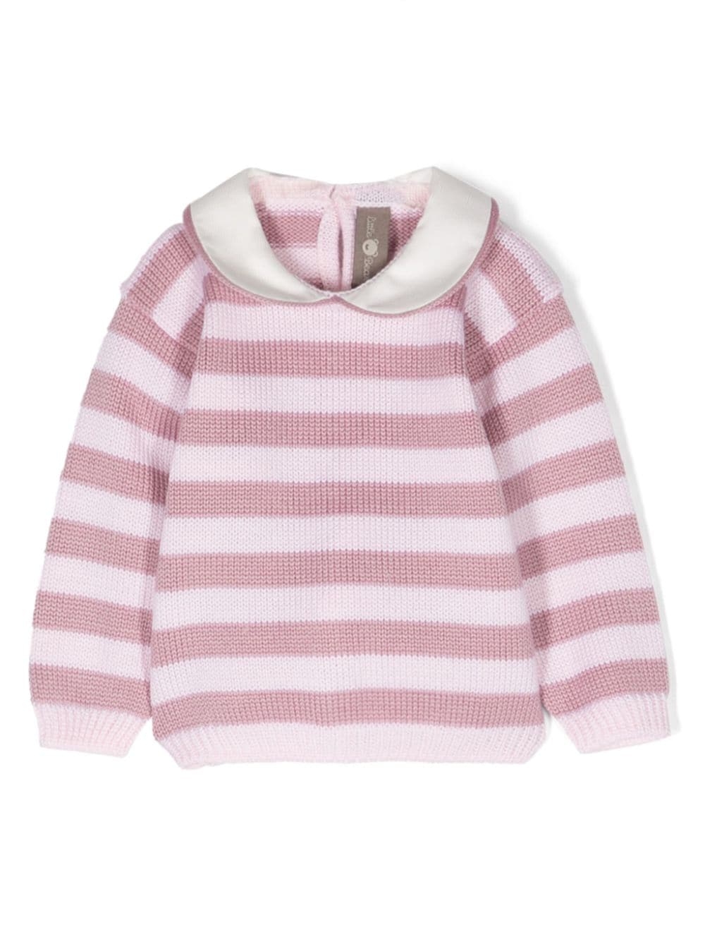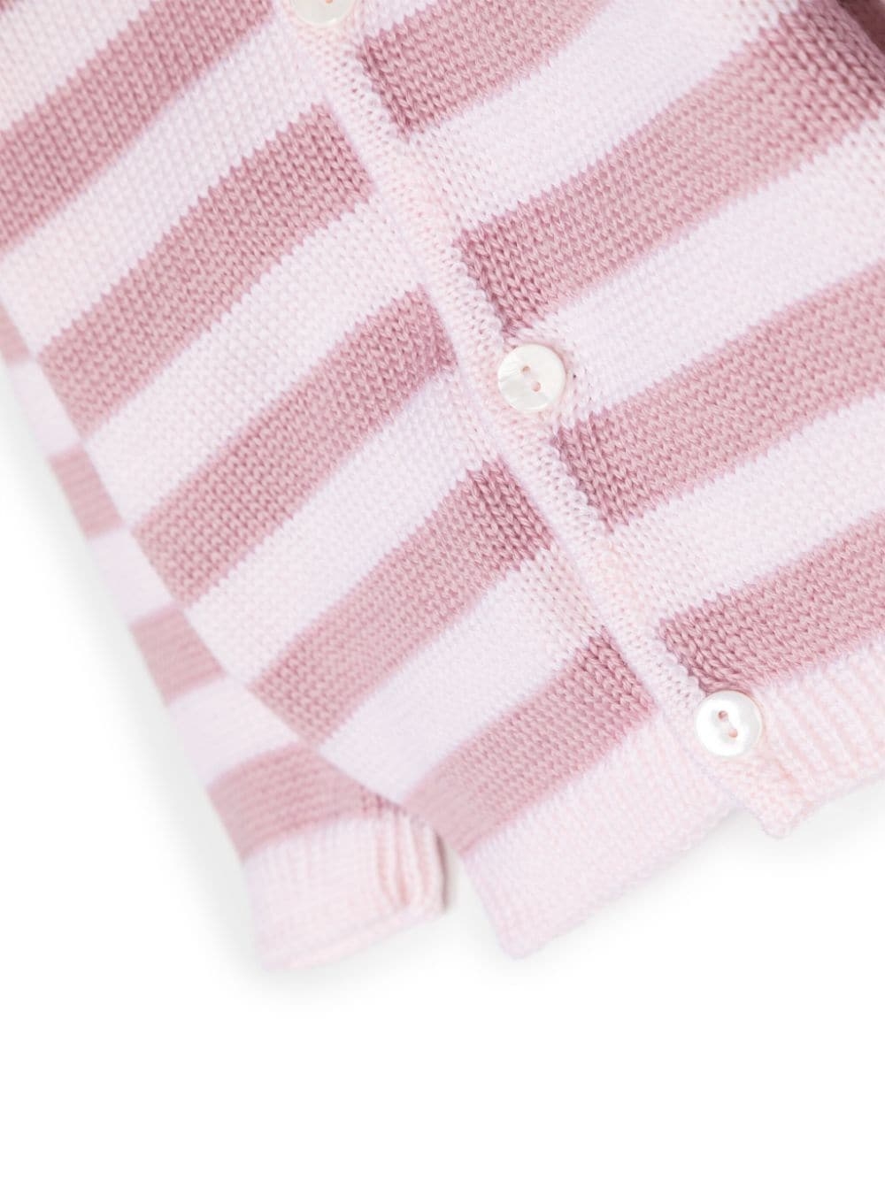 Rosa, lana vergine, motivo a righe orizzontali, maglia fine, colletto con pettorina, chiusura frontale con bottoni, maniche lunghe e orlo dritto.