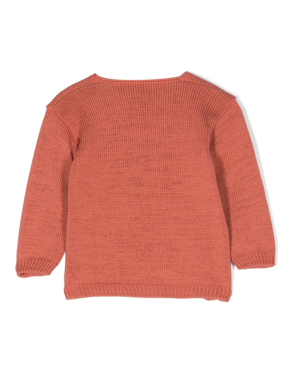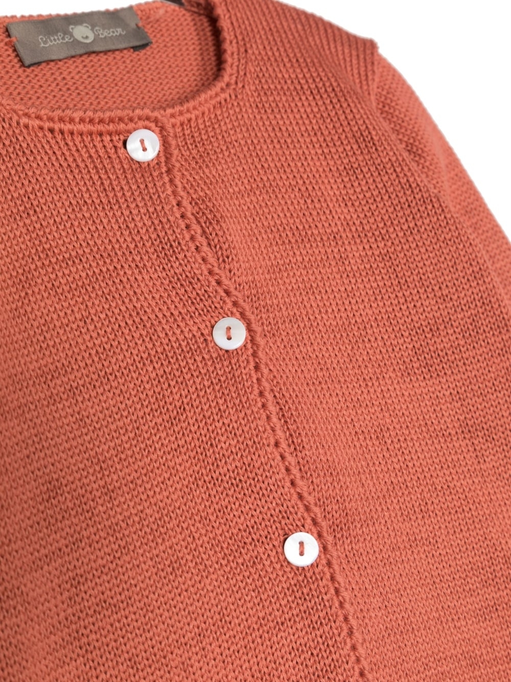 Arancione bruciato, cotone, design lavorato a maglia, scollo rotondo, chiusura frontale con bottoni, maniche lunghe e orlo dritto.