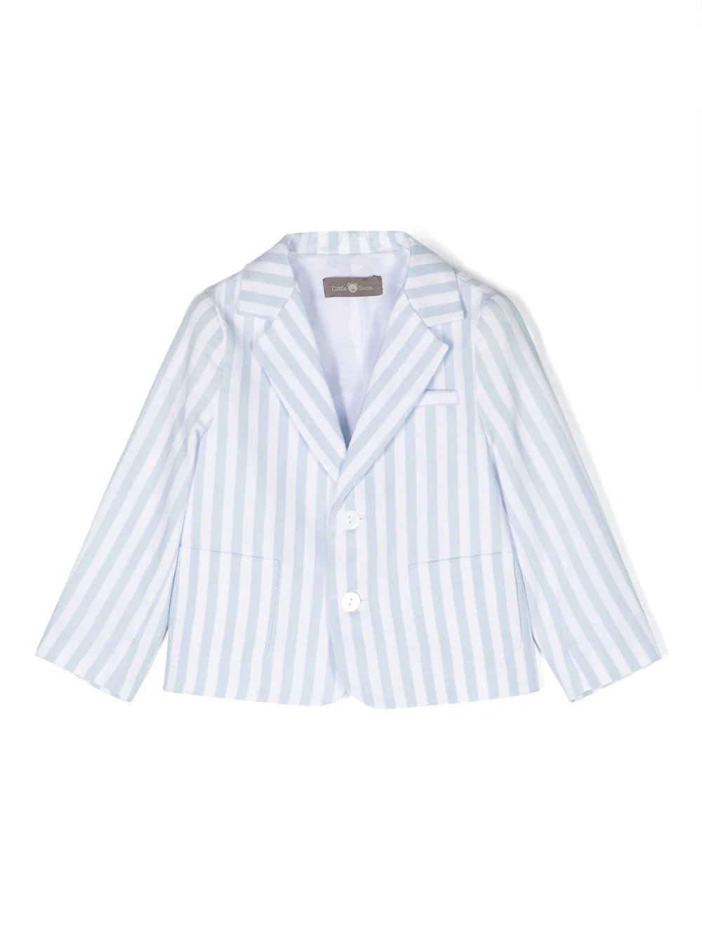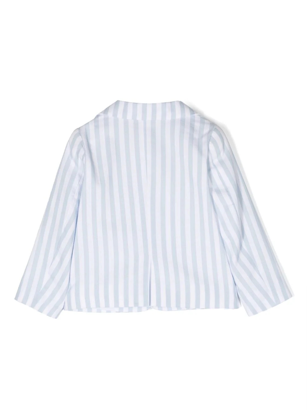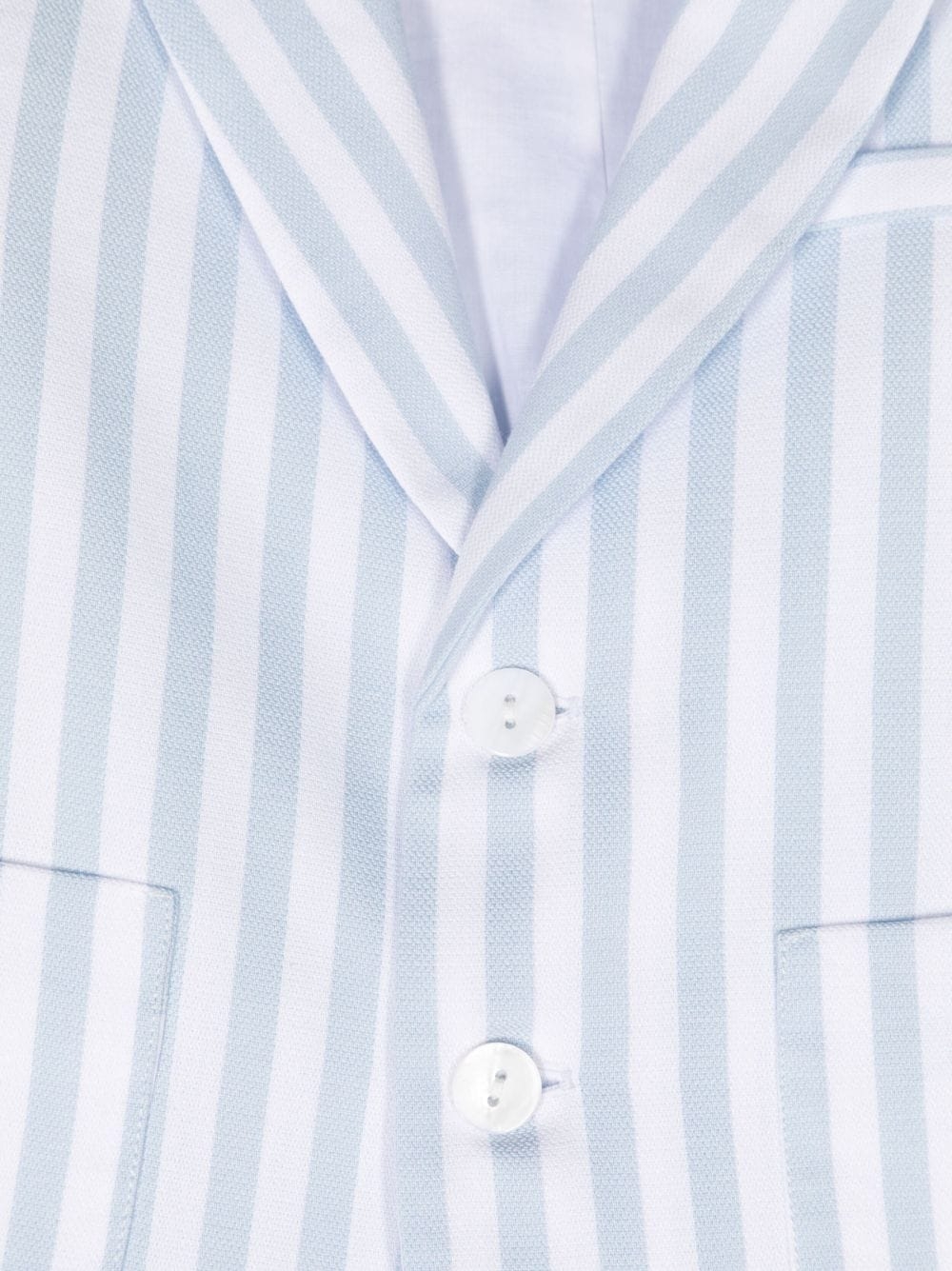 Giacca monopetto a righe verticali, revers classici, chiusura frontale con bottoni e spacco centrale posteriore.