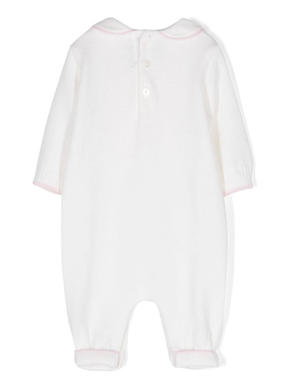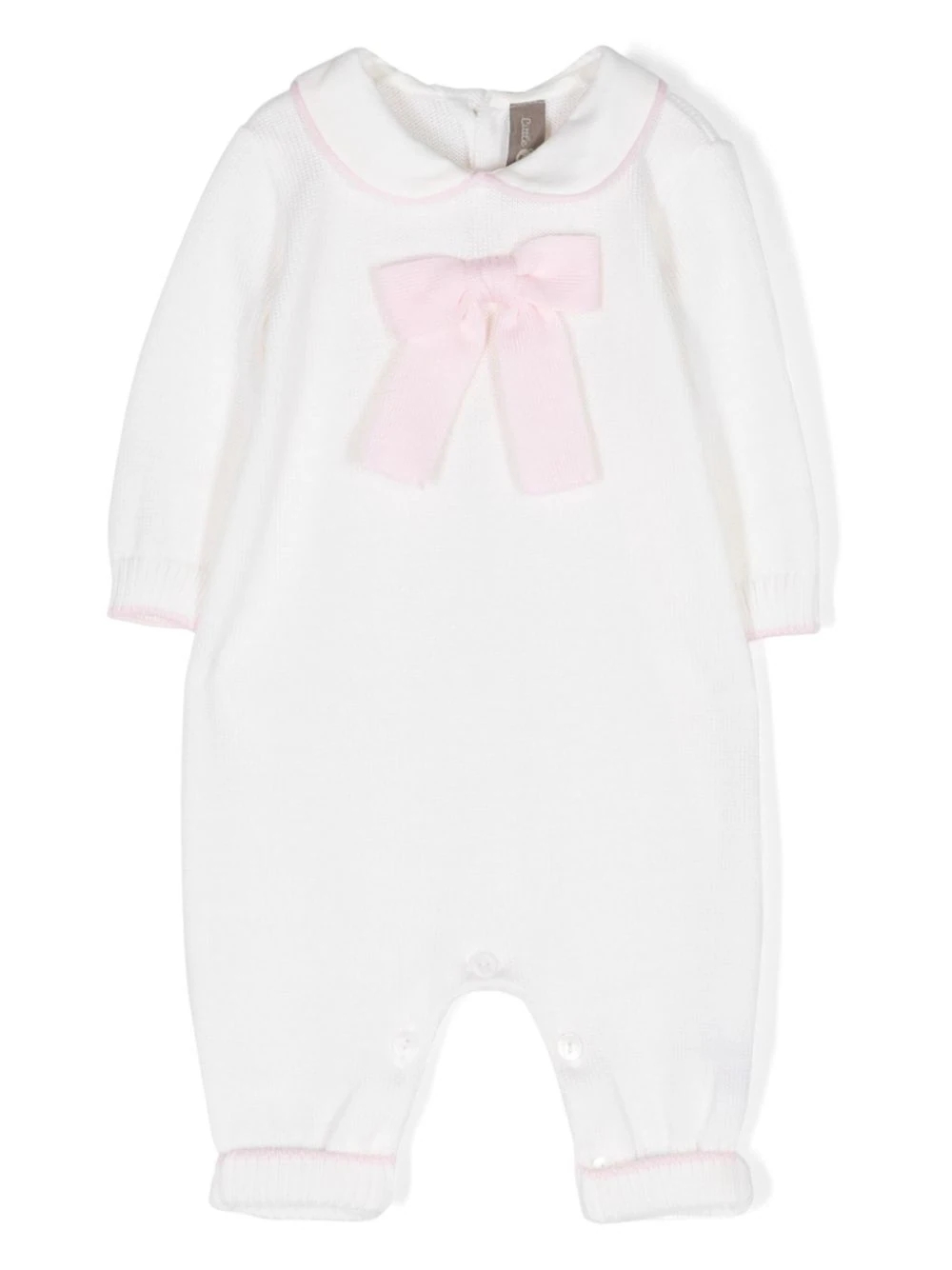 Tutina avorio in pura lana vergine, a maniche lunhge, con colletto peter pan, chiusura con bottoni sul retro e tra le gambe, polsini e caviglie a costine. È decorata con fiocco rosa sulla parte anteriore.