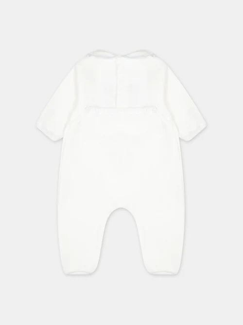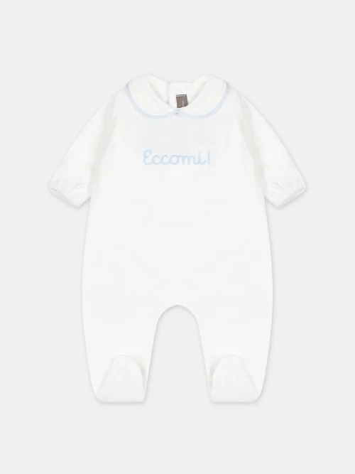 Tutina bianca in ciniglia, colletto, maniche lunghe con polsino elasticizzato, piedini, chiusura con ganci a pressione sulla parte posteriore. E' decorata con ricamo celeste Eccomi! sulla parte anteriore e rifinitura celeste sul colletto.
