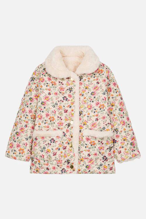 Cappotto reversibile con stampa da un lato e dall'altro in pelliccia sintetica.
