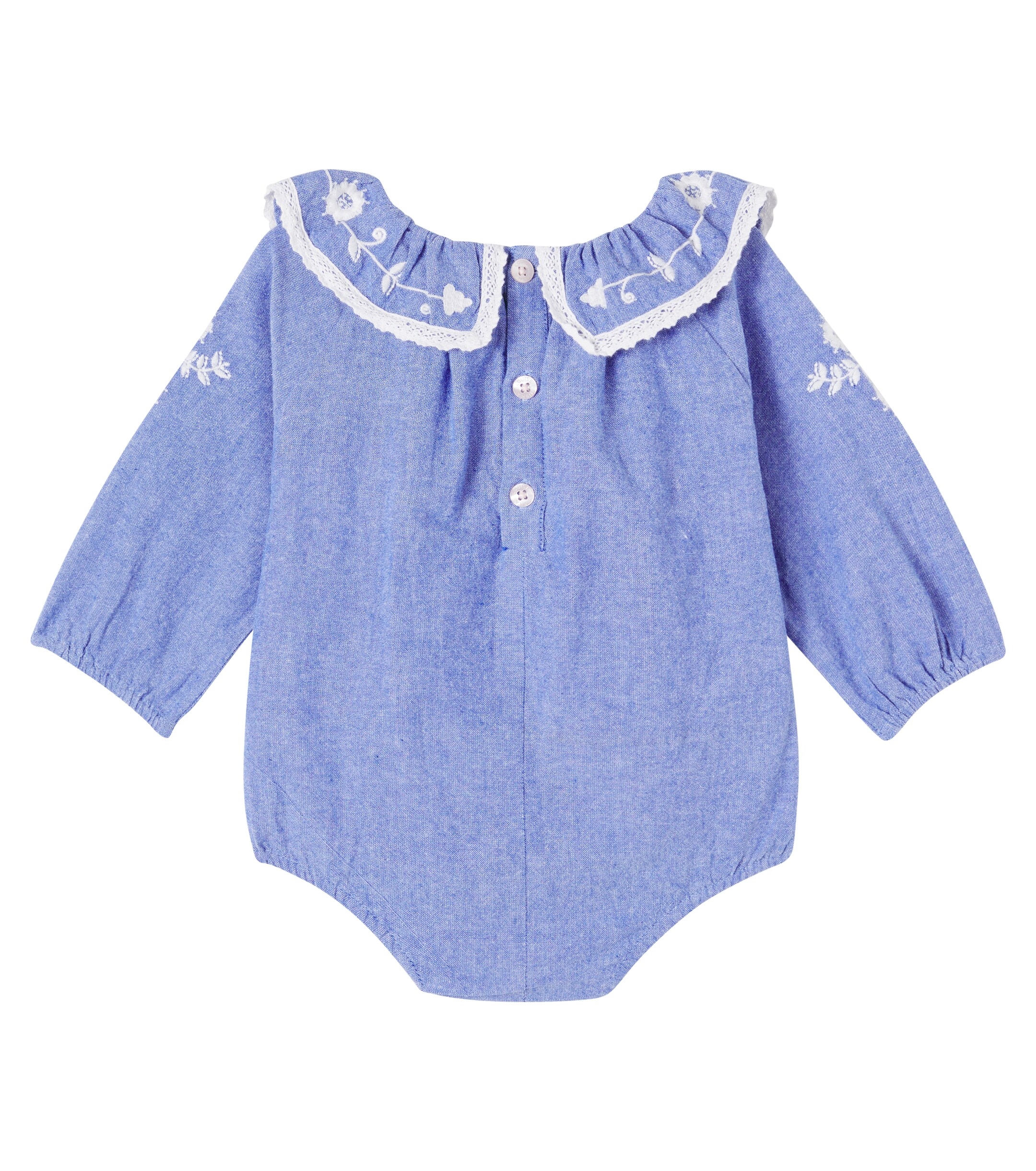 Tutina in Chambray con colletto oversize con volant con bordi in pizzo. Ricamo sulle maniche, polsini a coste elasticizzati,abbottonatura sul retro e apertura a scatto sul cavallo