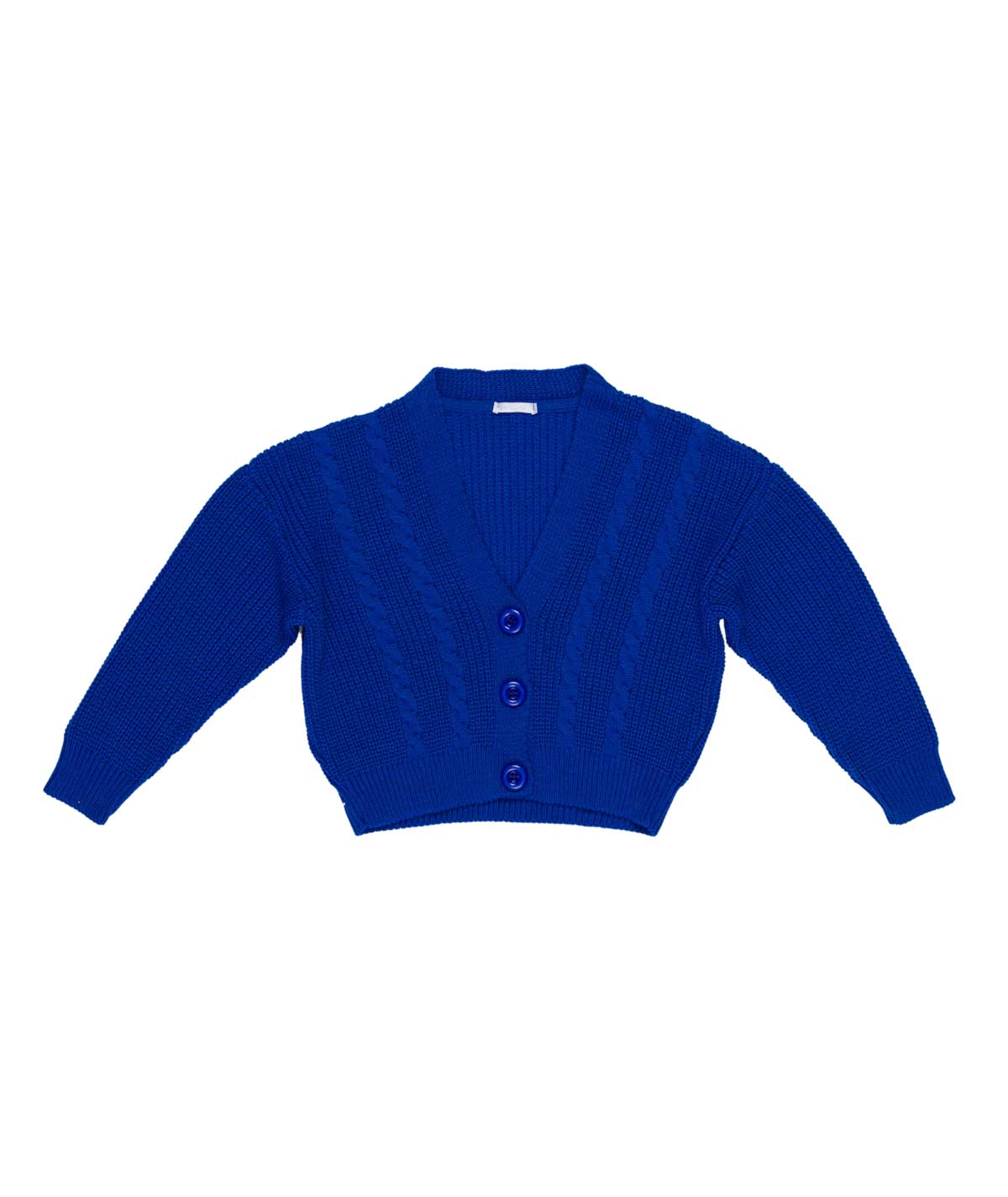 Cardigan blu, lavorato a maglia, corto.