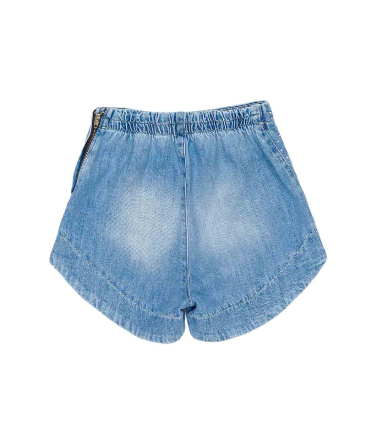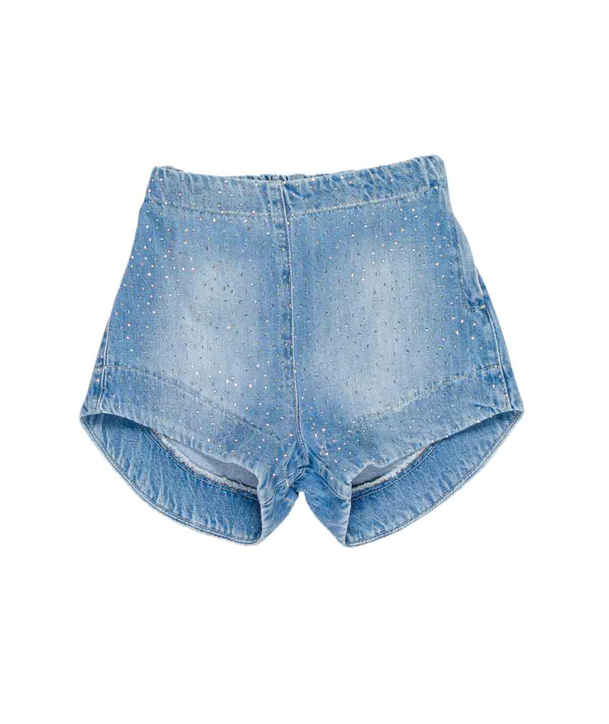 Shorts denim con strass, vita elasticizzata e chiusura laterale con zip