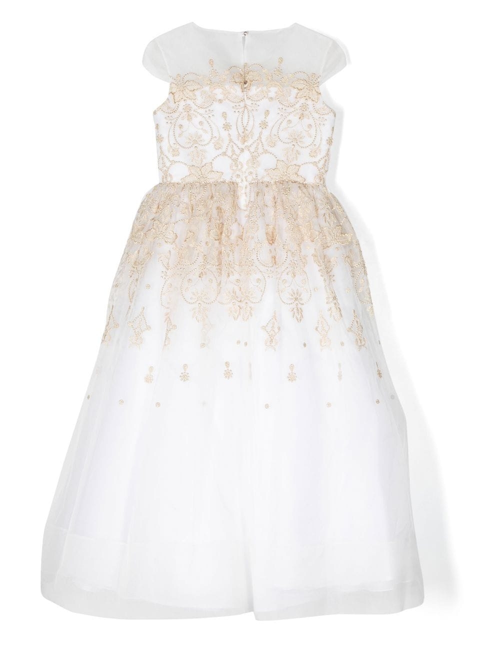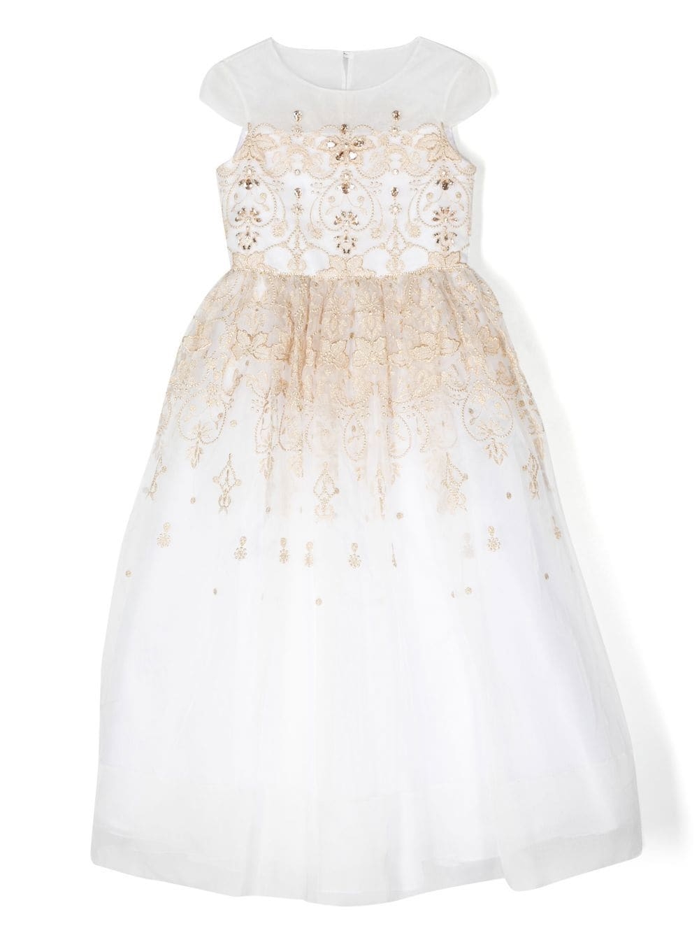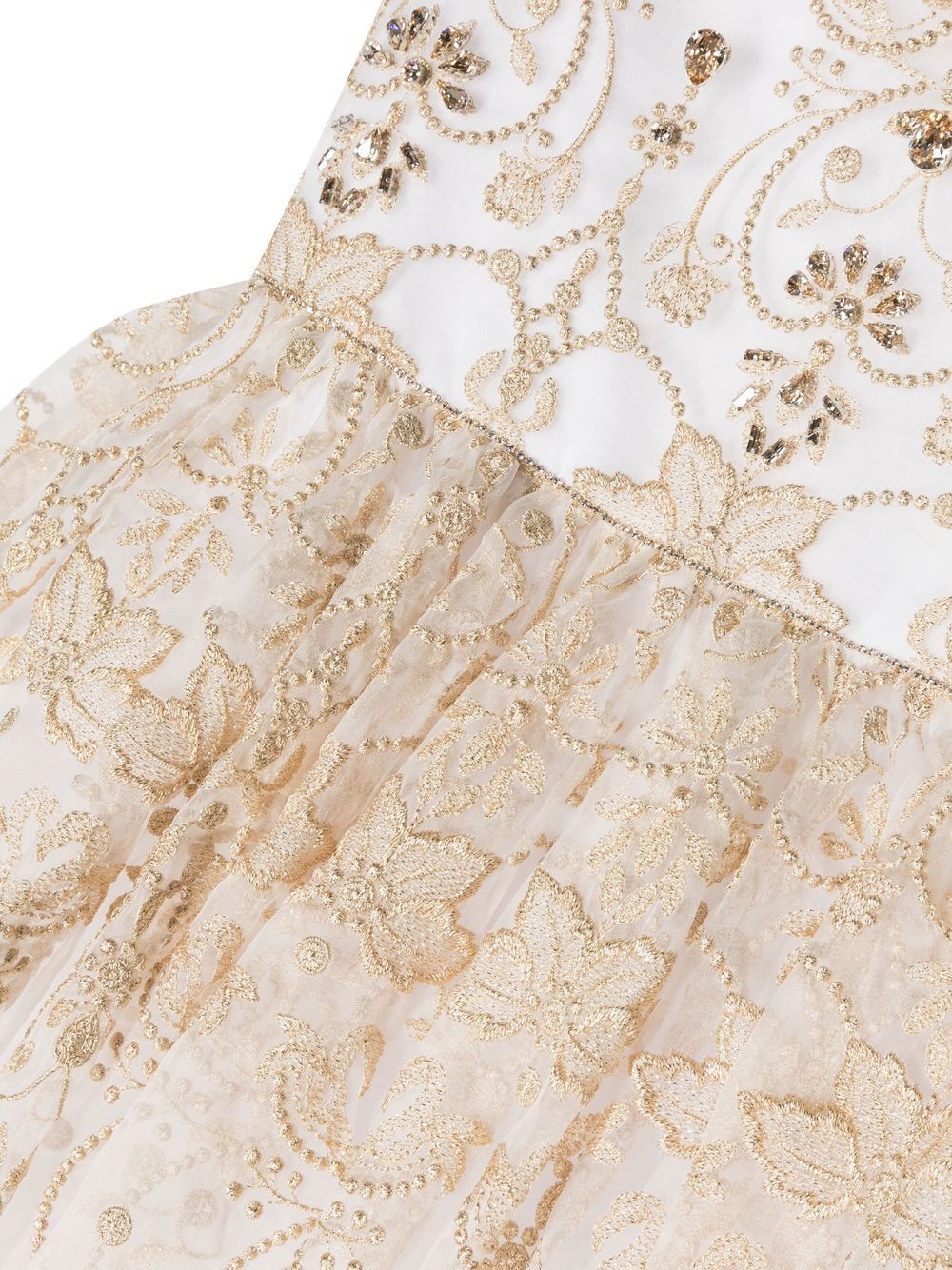 Abito ricamato con spalle scoperte di MARCHESA KIDS COUTURE con ricami floreali all-over, abbellimento di cristalli, senza maniche, maxi e tonalità bianco/oro.