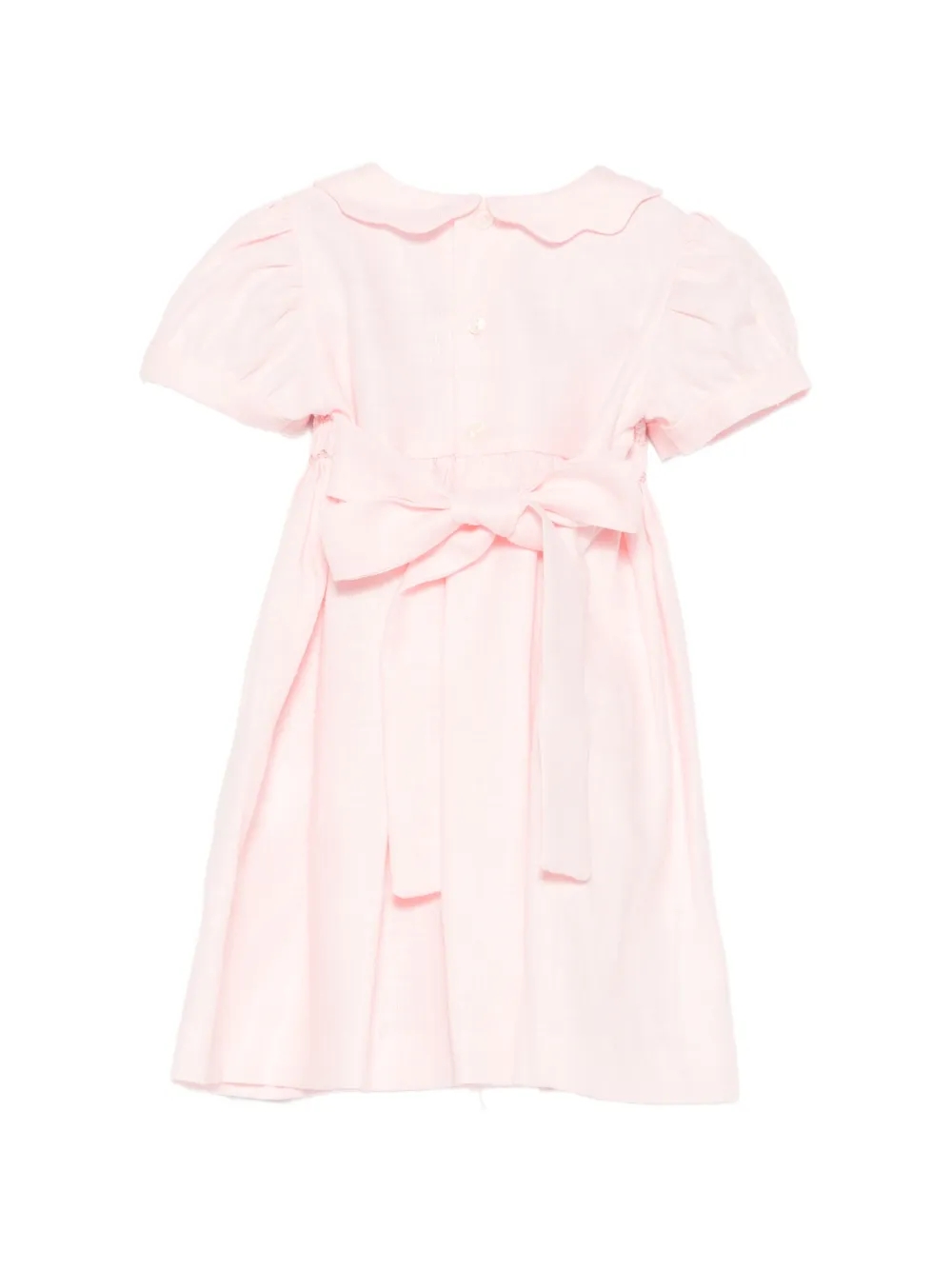 Abito con ricami floreali, colletto Peter Pan, maniche corte a sbuffo, chiusura con bottoni e fiocco sul retro