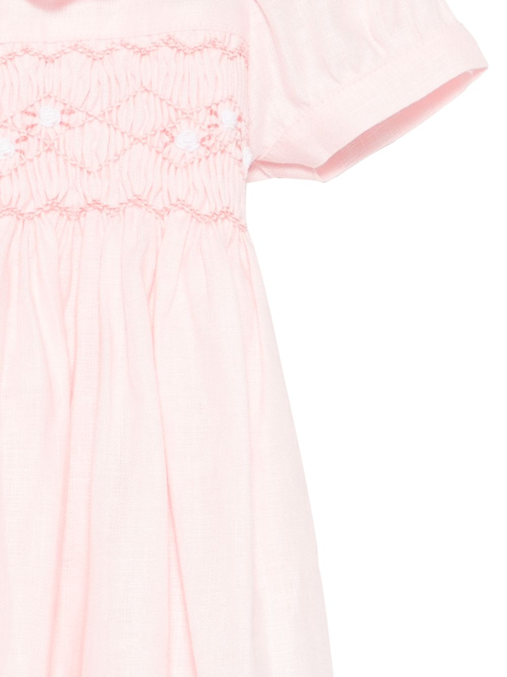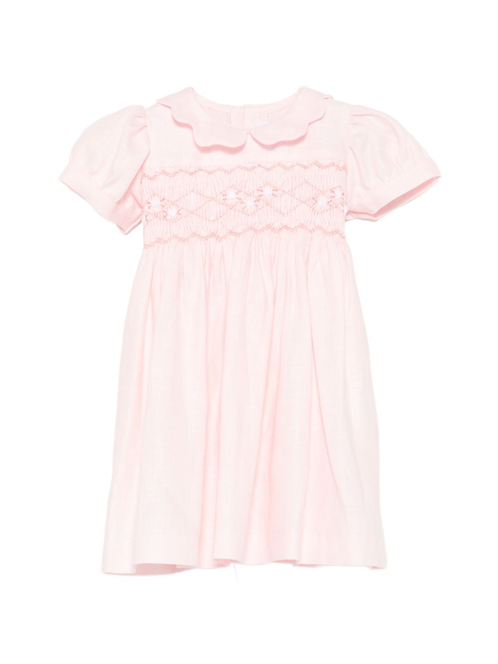 Abito con ricami floreali, colletto Peter Pan, maniche corte a sbuffo, chiusura con bottoni e fiocco sul retro