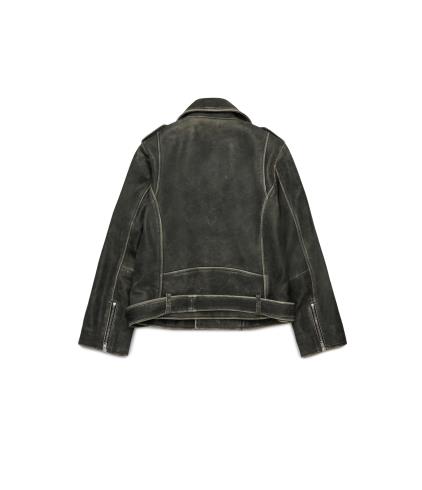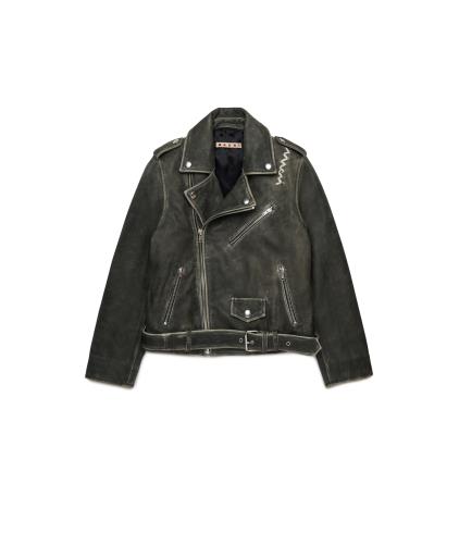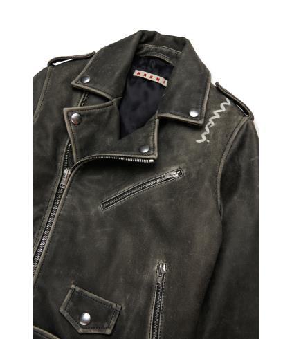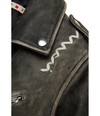 Giubbino in vera pelle dall'aspetto vissuto, con collo a revers e zip decentrata. Cintura con fibbia sull'orlo tasca e polsini con zip. Marni Symbol oversize cucito a mano sulla spalla.