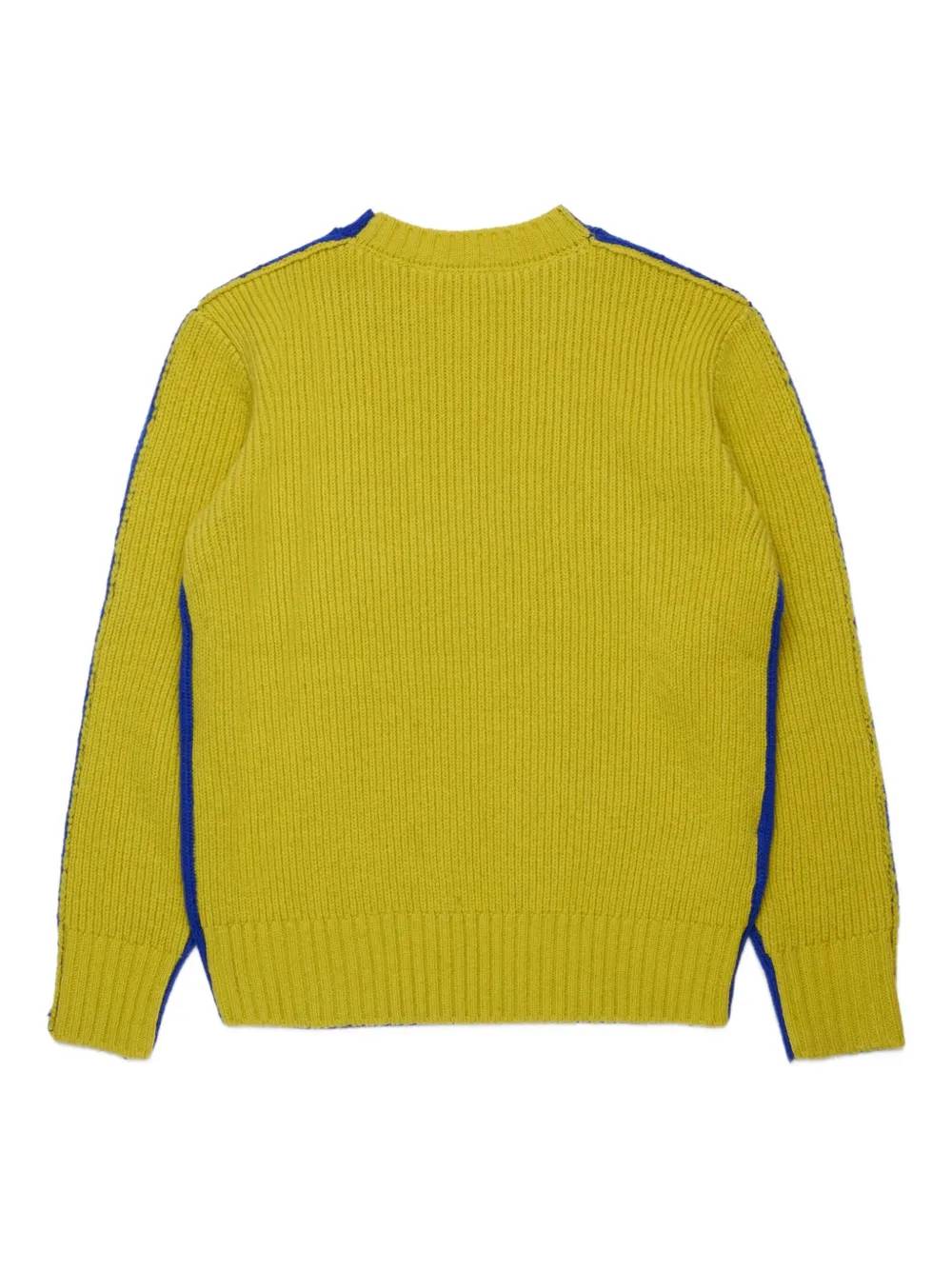Maglia rasata sul davanti blu , lavorazione a costine sul retro giallo