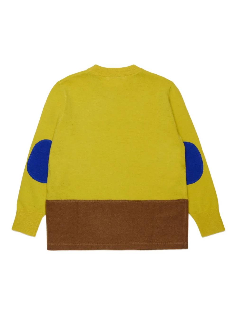 Pull girocollo a manica lunga in misto lana, caratterizzato da un originale design colorblock con lavorazioni a contrasto e toppe sui gomiti. Logo ricamato sul davanti.