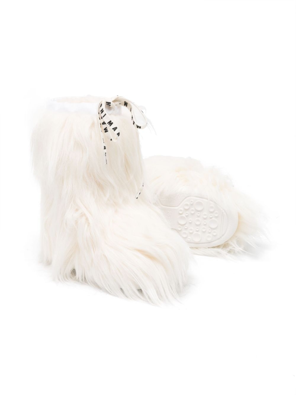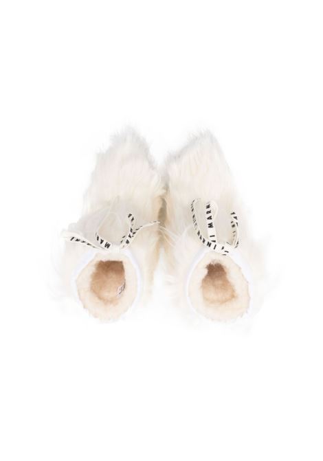 Stivali in finta pelliccia, bianco, fascia con logo stampato, punta tonda, chiusura frontale con lacci e suola piatta in gomma.