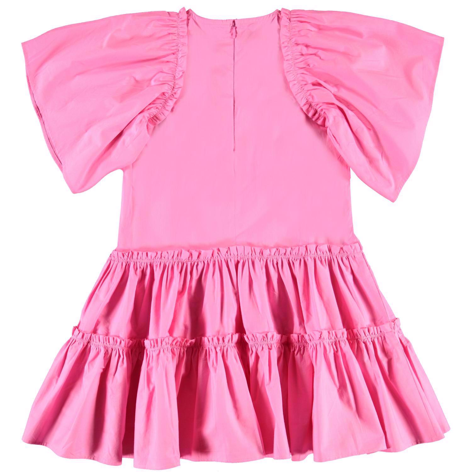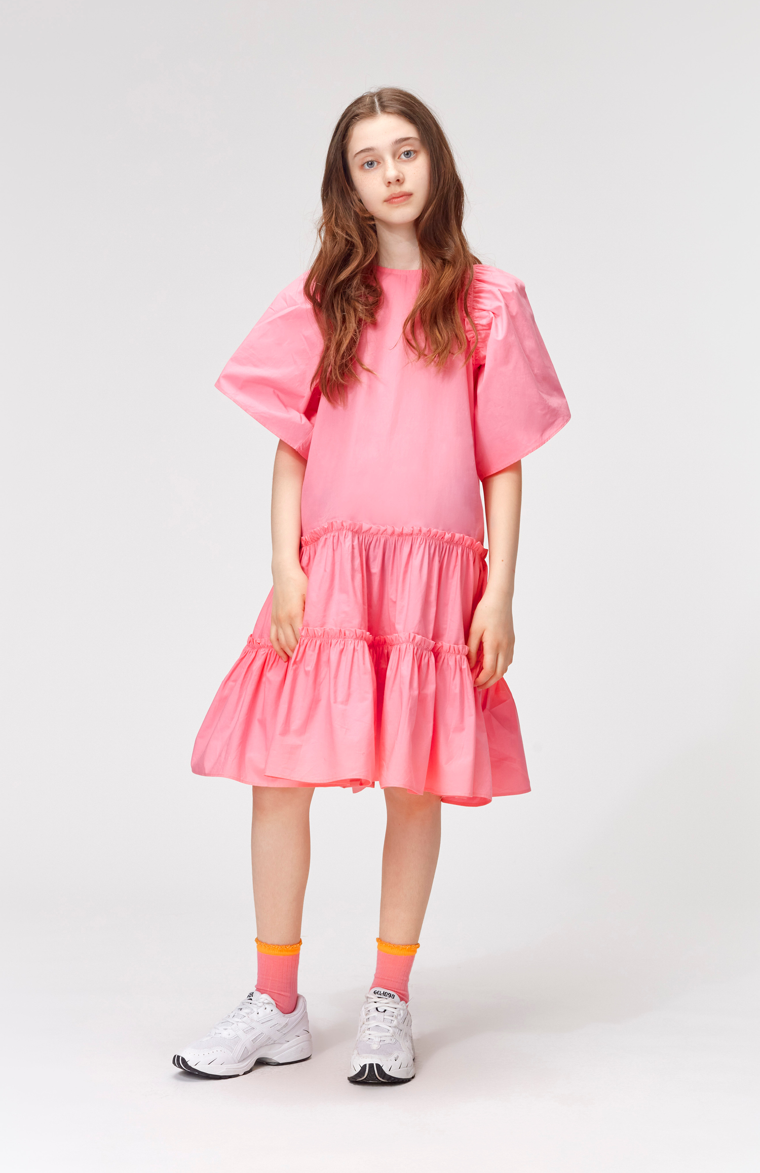 Dettaglio con ruches, scollo rotondo, maniche corte, chiusura posteriore con zip e gonna con balze.