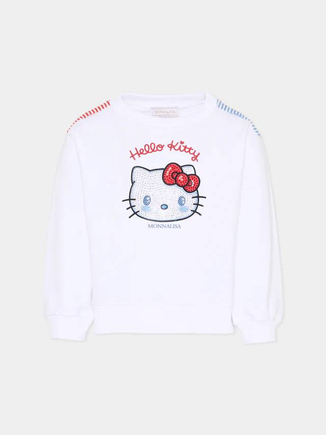 Felpa bianca, a maniche lunghe, in cotone misto spazzolato con collo rotondo, fiocco blu sulla spalla sinistra, fiocco rosso sulla spalla destra e polsini e orlo a costole. È decorata con stampe Hello Kitty e strass sul davanti.