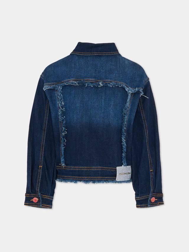 Giacca di jeans a maniche lunghe con colletto appuntito, chiusura frontale con bottoni, dettagli sfilacciati e tasche sul petto a righe rosse e blu. È decorata con un motivo di Hello Kitty e caramelle di strass sul davanti e un logo lurex applicato sul retro.