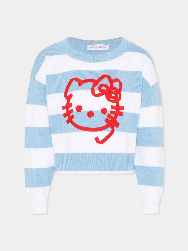 Pull a righe azzurro chiaro con maniche lunghe, collo rotondo, polsini a coste e orlo. È decorata con grosgrain rosso Hello Kitty.