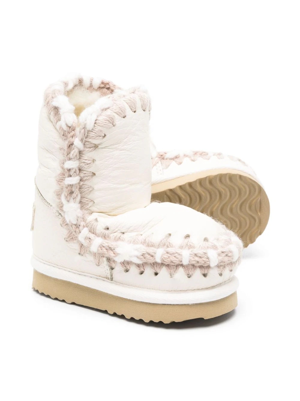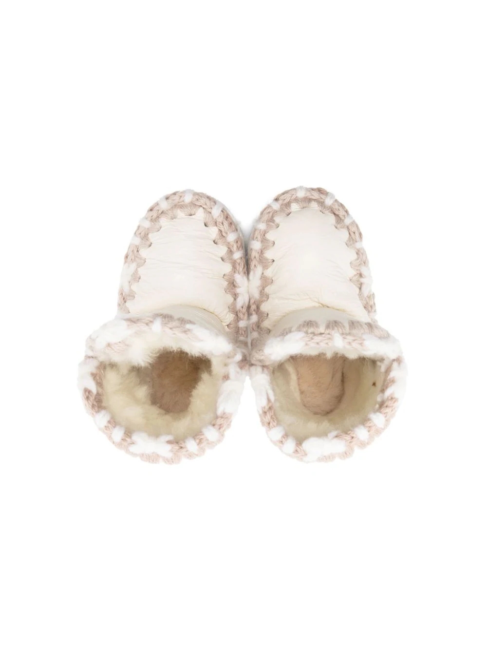 Eskimo 24 bianco Bianco gesso, grigio talpa, pelle di pecora, lana, effetto stropicciato, rifinitura crochet, applicazione posteriore con logo, punta tonda, design slip-on, suola piatta in gomma e fodera in shearling.