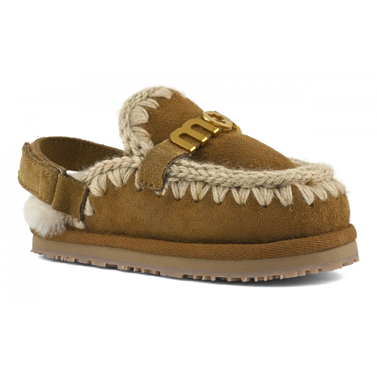 con cinturino alla caviglia e logo in metallo realizzata artigianalmente in vera pelle di montone double-face con gli inconfondibili dettagli in lana