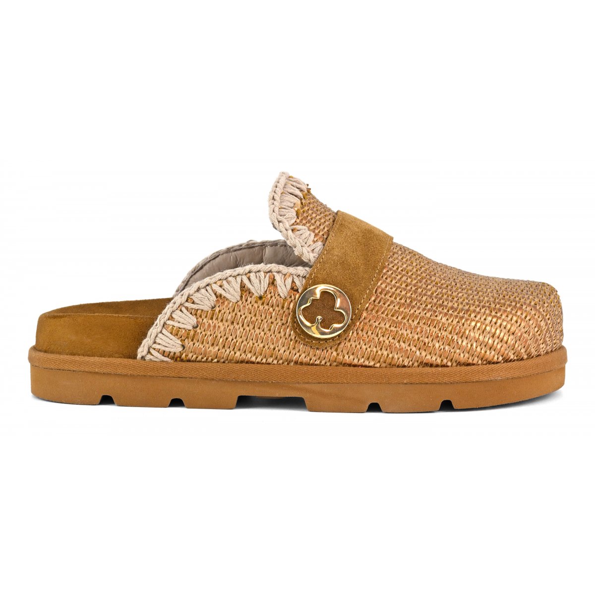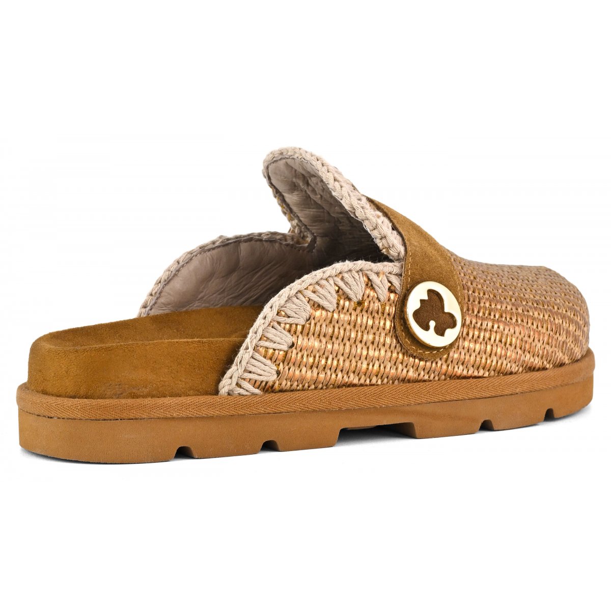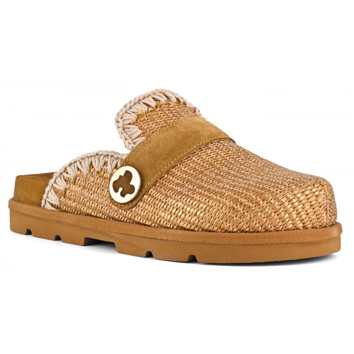 Sabot in raffia con una speciale finitura metallizzata. Questo capo leggero e realizzato a mano è stato rifinito con le originali cuciture all'uncinetto distintive di mou e un plantare imbottito in microsuede