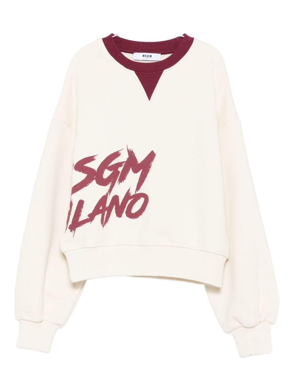 Felpa panna con logo stampato sul davanti bordeaux. Collo a confrasto e orlo e polsini a coste100% cotone