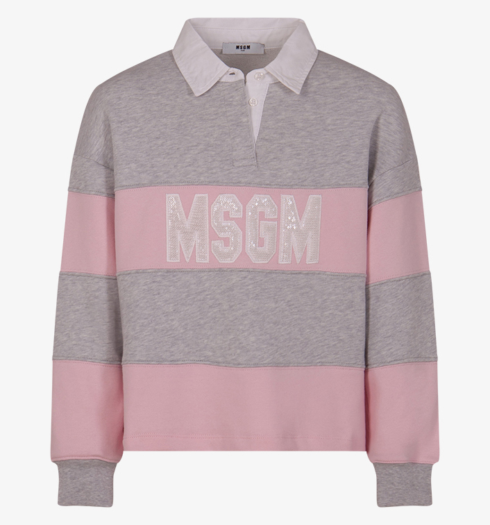 Felpa rigata rosa e grigia , con stampa cucita sul davanti , e colletto bianco