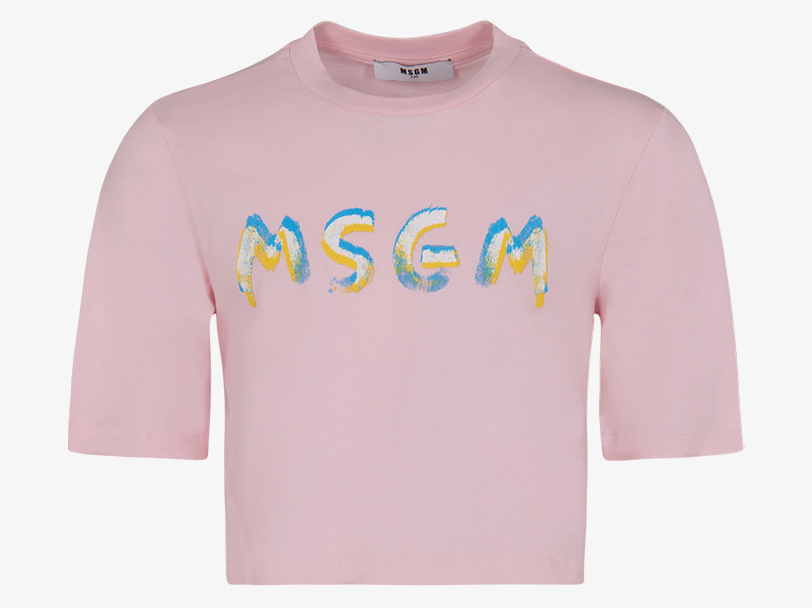 T-shirt crop con stampa , di colore rosa e scritta multicolor