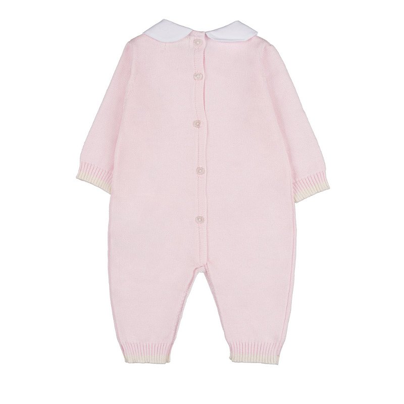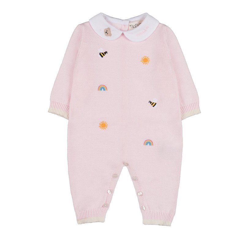 Tutina con ricamo in filo rosa,con colletto,abbottonatura sul retro. Senza piedi