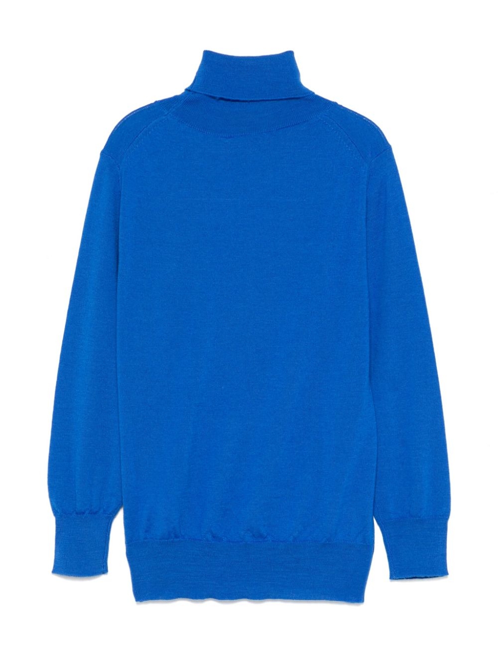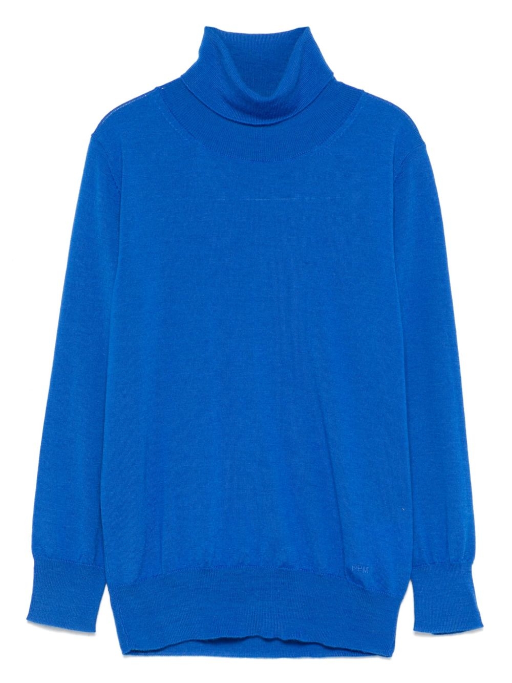 lana merino grigio medio, maglia fine effetto mélange, bordino a coste, collo alto, maniche lunghe, logo ricamato sul lato e orlo dritto