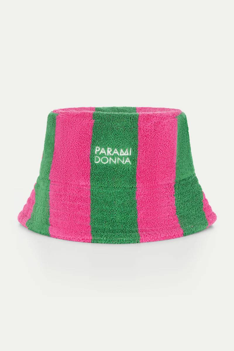 Con il caratteristico motivo a righe del marchio in vivaci smeraldo e fucsia