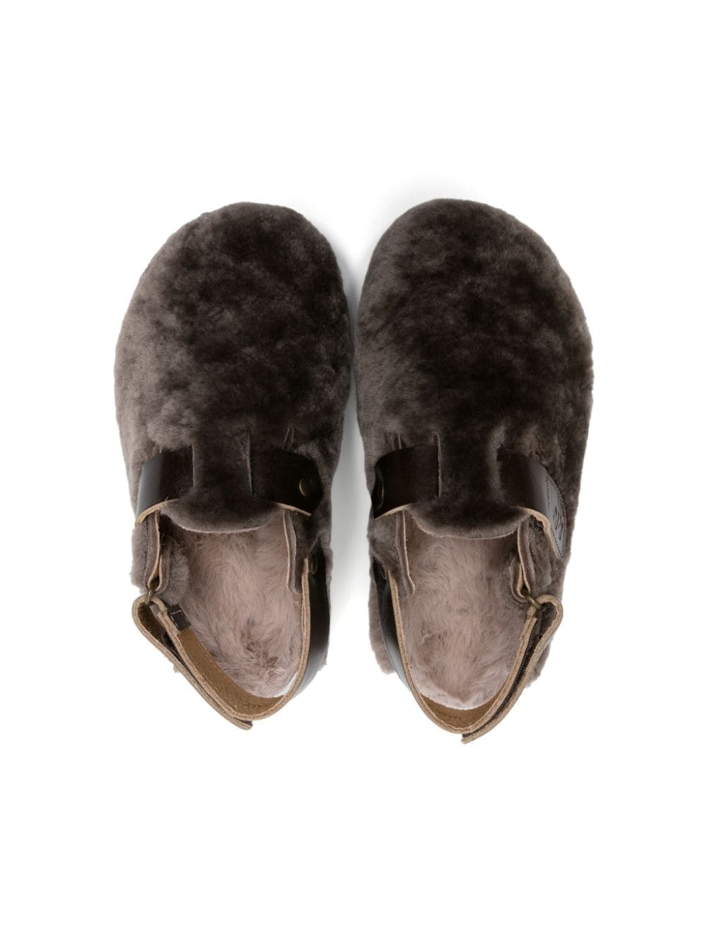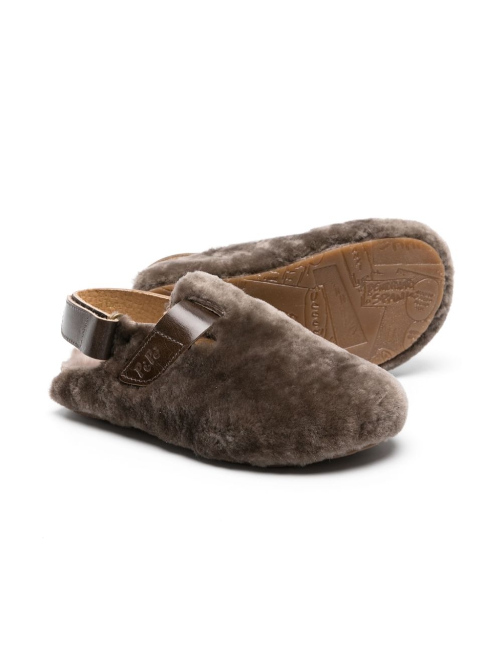 Logo laterale inciso, cinturino posteriore, chiusura posteriore a strappo e fodera in pelliccia cruelty-free.