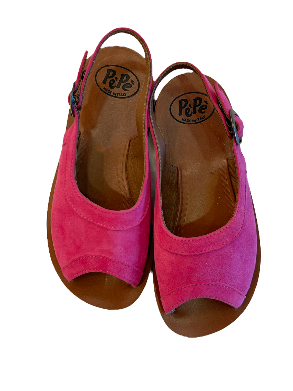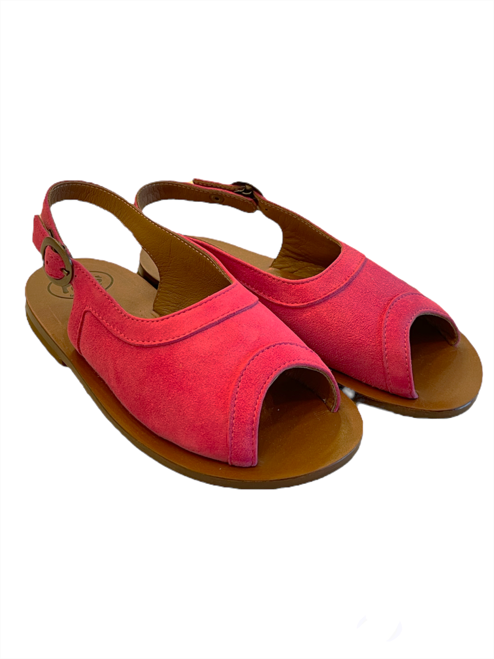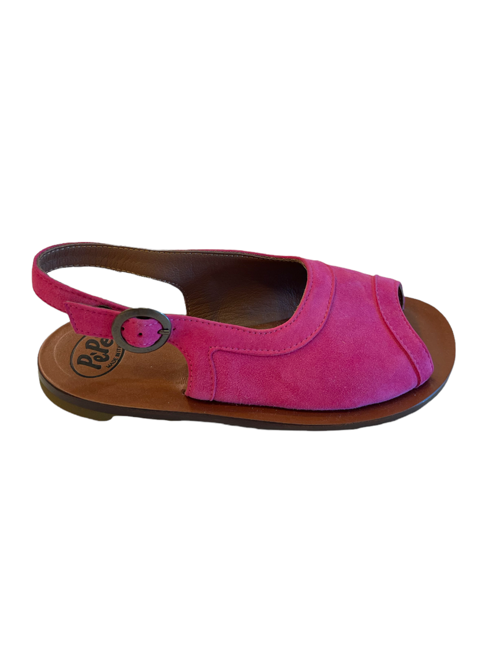 Cinturino alla caviglia con fibbia, punta aperta, soletta con logo e suola piatta. Materiale: pelle. Colore FUXIA
