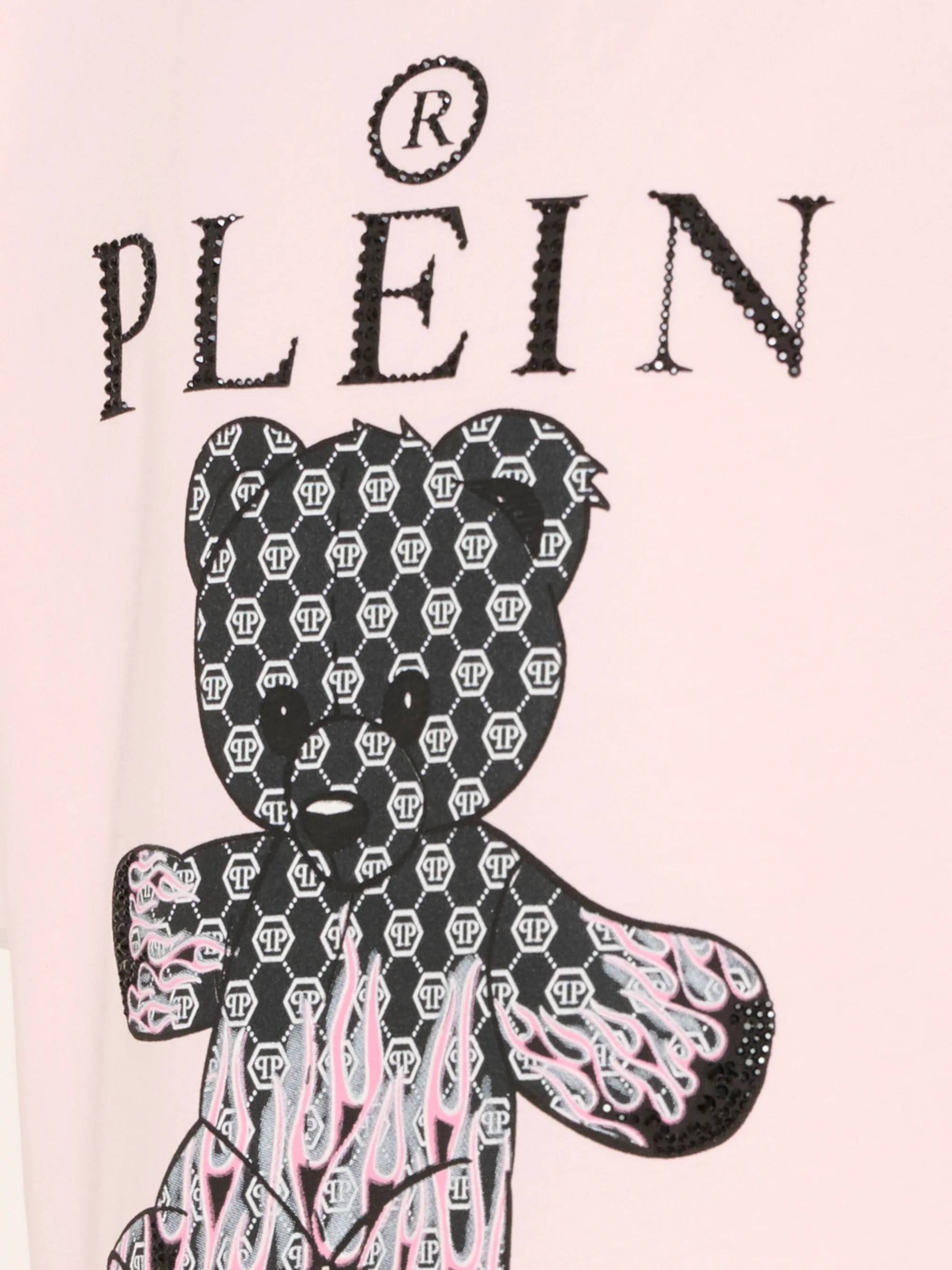T-shirt rosa realizzata in jersey di cotone, con maniche corte e girocollo a costine. È decorata con orsetto logato e logo di strass, sulla parte anteriore e patch logato sul retro. Made in Italy