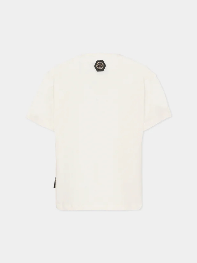 T-shirt avorio realizzata in jersey di cotone, con maniche corte e girocollo a costine. È decorata con logo di strass sulla parte anteriore e logo in metallo sul retro.