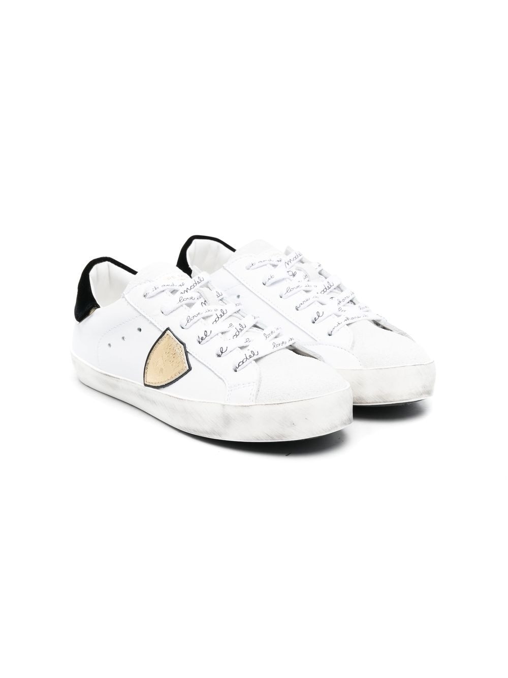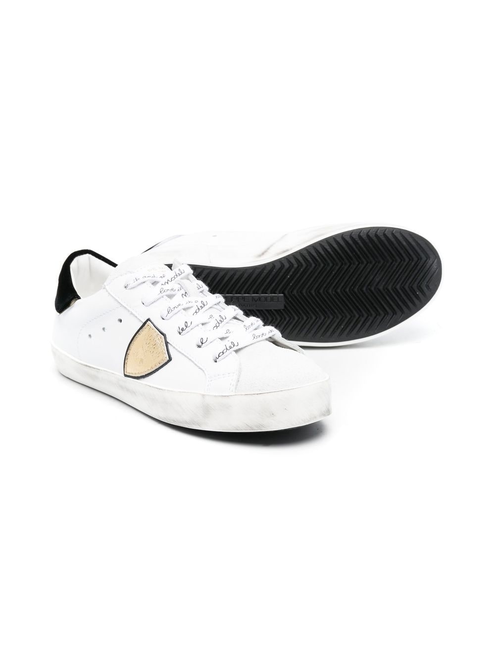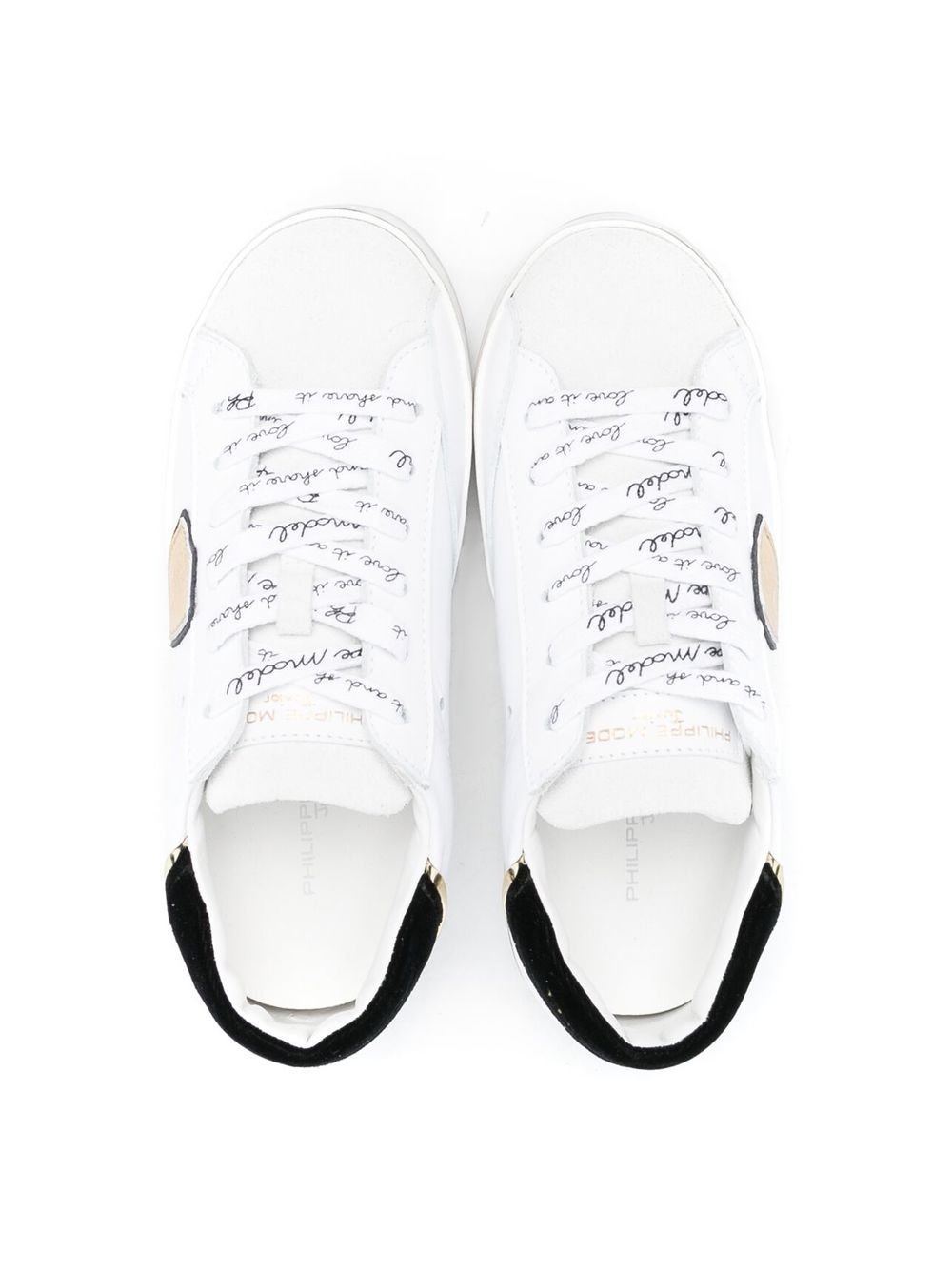 Nero/bianco, color oro, pelle di vitello, effetto spazzolato, rinforzo nel tallone a contrasto, applicazione laterale con logo, lacci con logo stampato, punta tonda, soletta con logo e suola piatta in gomma.