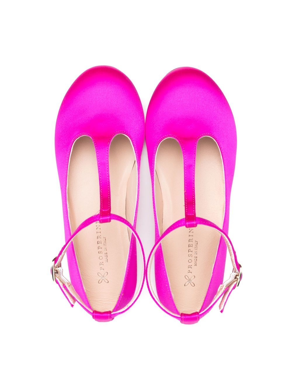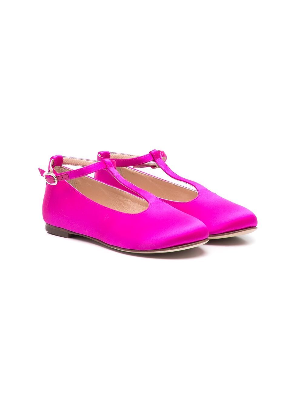 Ballerine in raso fucsia con barra a T in raso di PROSPERINE KIDS con finitura satinata, punta tonda, chiusura con barra a T, soletta con logo e suola piatta in gomma.