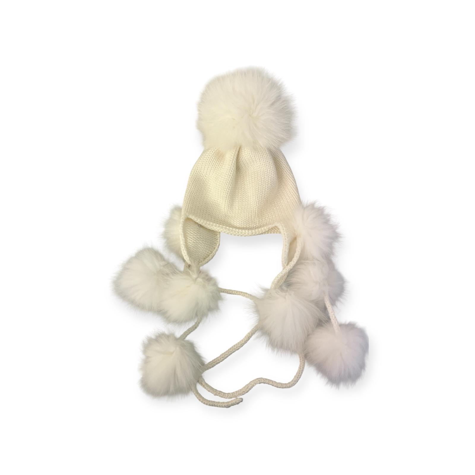 Berretto in lana bianco con tanti pompon in volpe pendenti.