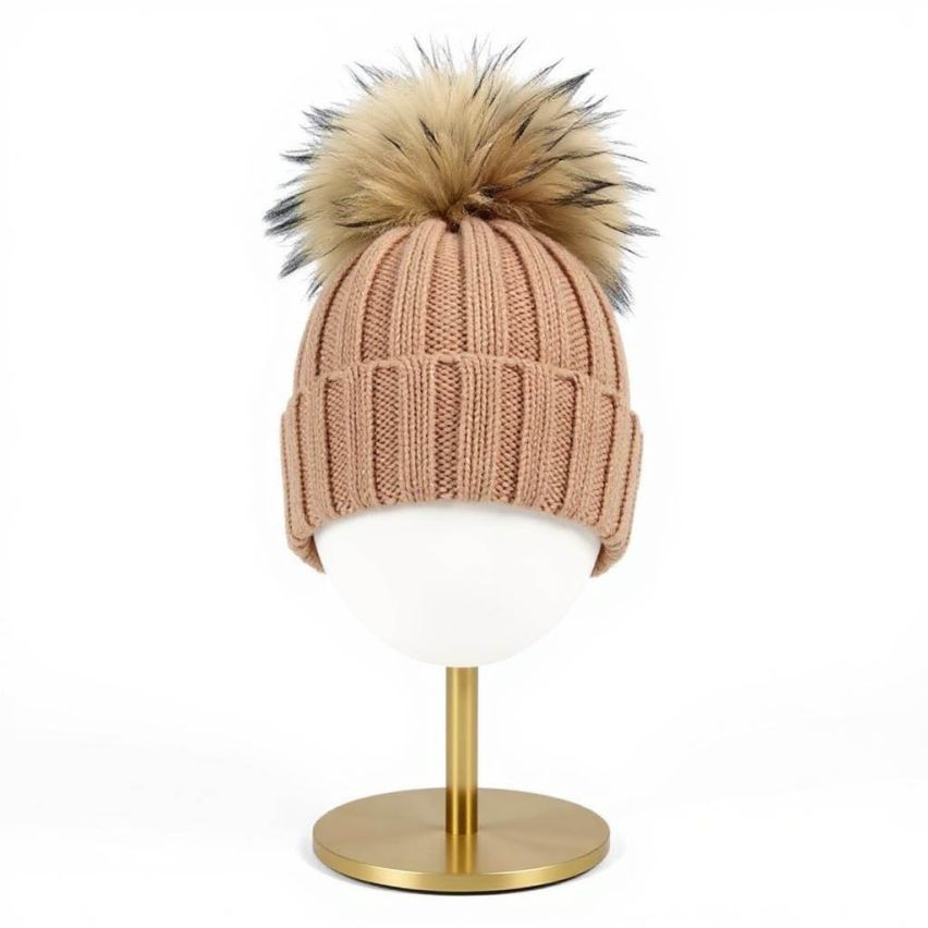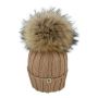 Berretto in lana Cammello con pompon in pelliccia di Murmasky naturale