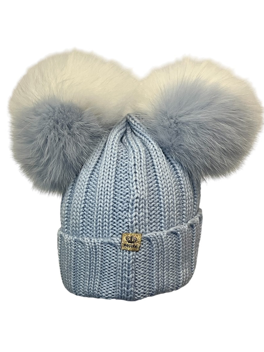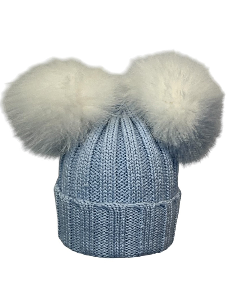 Berretto in lana misto cashmere Azzurro con due pompon in pelliccia di volpe bianco e azzurro. Maglia morbida, sottile, soffice, liscia sopra, con risvolto a coste. Vestibilità confortevole, comodo, tende leggermente a cedere.